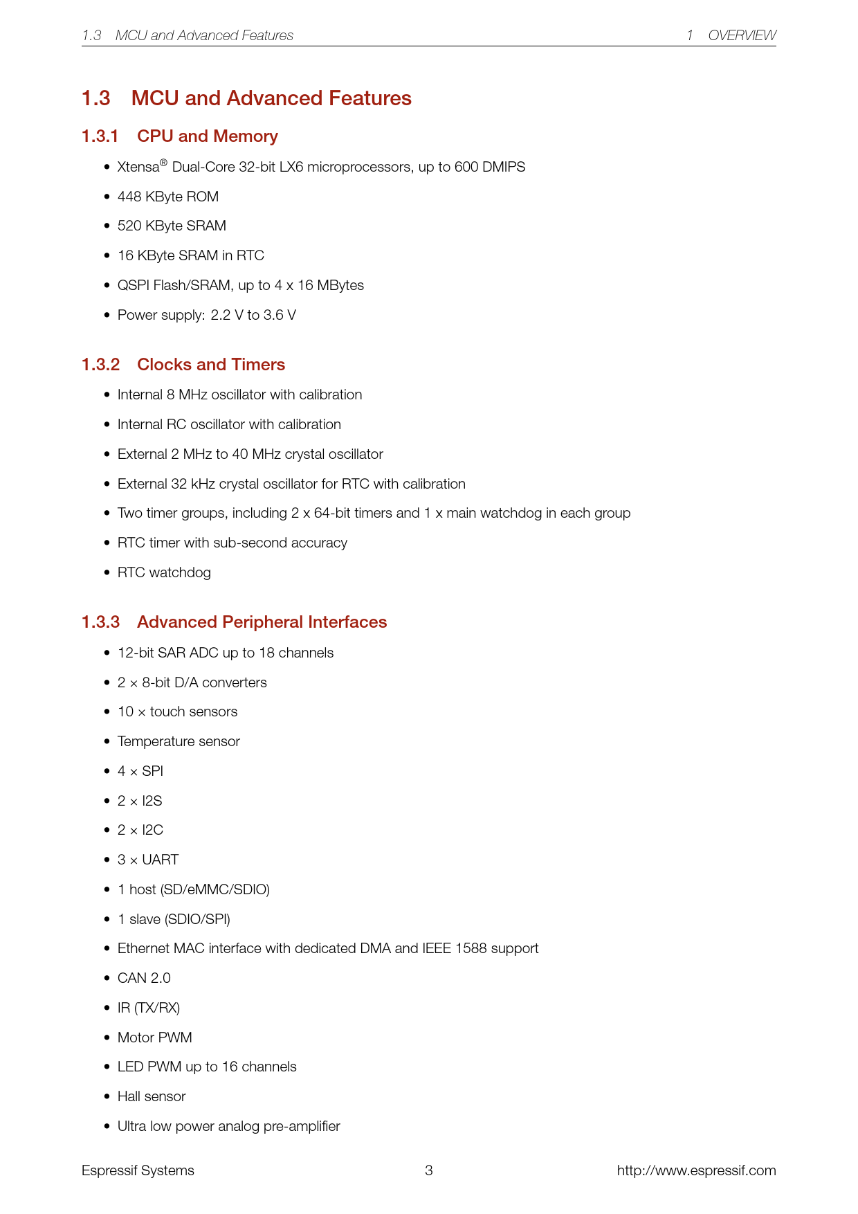 1.3 MCU and Advanced Features 1 OVERVIEW 1.3 MCU and Advanced Features 1.3.1 CPU and Memory • Xtensa® Dual-Core 32-bit LX6 microprocessors, up to 600 DMIPS • 448 KByte ROM • 520 KByte SRAM • 16 KByte SRAM in RTC • QSPI Flash/SRAM, up to 4 x 16 MBytes • Power supply: 2.2 V to 3.6 V 1.3.2 Clocks and Timers • Internal 8 MHz oscillator with calibration • Internal RC oscillator with calibration • External 2 MHz to 40 MHz crystal oscillator • External 32 kHz crystal oscillator for RTC with calibration • Two timer groups, including 2 x 64-bit timers and 1 x main watchdog in each group • RTC timer with sub-second accuracy • RTC watchdog 1.3.3 Advanced Peripheral Interfaces • 12-bit SAR ADC up to 18 channels • 2 × 8-bit D/A converters • 10 × touch sensors • Temperature sensor • 4 × SPI • 2 × I2S • 2 × I2C • 3 × UART • 1 host (SD/eMMC/SDIO) • 1 slave (SDIO/SPI) • Ethernet MAC interface with dedicated DMA and IEEE 1588 support • CAN 2.0 • IR (TX/RX) • Motor PWM • LED PWM up to 16 channels • Hall sensor • Ultra low power analog pre-amplifier Espressif Systems 3 http://www.espressif.com Document Outline Overview Featured Solutions Ultra Low Power Solution Complete Integration Solution Basic Protocols Wi-Fi Bluetooth MCU and Advanced Features CPU and Memory Clocks and Timers Advanced Peripheral Interfaces Security Development Support Application Block Diagram Pin Definitions Pin Layout Pin Description Power Scheme Strapping Pins Functional Description CPU and Memory CPU Internal Memory External Flash and SRAM Memory Map Timers and Watchdogs 64-bit Timers Watchdog Timers System Clocks CPU Clock RTC Clock Audio PLL Clock Radio 2.4 GHz Receiver 2.4 GHz Transmitter Clock Generator Wi-Fi Wi-Fi Radio and Baseband Wi-Fi MAC Wi-Fi Firmware Packet Traffic Arbitration (PTA) Bluetooth Bluetooth Radio and Baseband Bluetooth Interface Bluetooth Stack Bluetooth Link Controller RTC and Low-Power Management Peripheral Interface General Purpose Input / Output Interface (GPIO) Analog-to-Digital Converter (ADC) Ultra Low Noise Analog Pre-Amplifier Hall Sensor Digital-to-Analog Converter (DAC) Temperature Sensor Touch Sensor Ultra-Lower-Power Coprocessor Ethernet MAC Interface SD/SDIO/MMC Host Controller Universal Asynchronous Receiver Transmitter (UART) I2C Interface I2S Interface Infrared Remote Controller Pulse Counter Pulse Width Modulation (PWM) LED PWM Serial Peripheral Interface (SPI) Accelerator Electrical Characteristics Absolute Maximum Ratings Recommended Operating Conditions RF Power Consumption Specifications Wi-Fi Radio Bluetooth Radio Receiver - Basic Data Rate Transmitter - Basic Data Rate Receiver - Enhanced Data Rate Transmitter - Enhanced Data Rate Bluetooth LE Radio Receiver Transmitter Package Information Supported Resources Related Documentation Community Resources Appendix A - Touch Sensor Appendix B - Code Examples