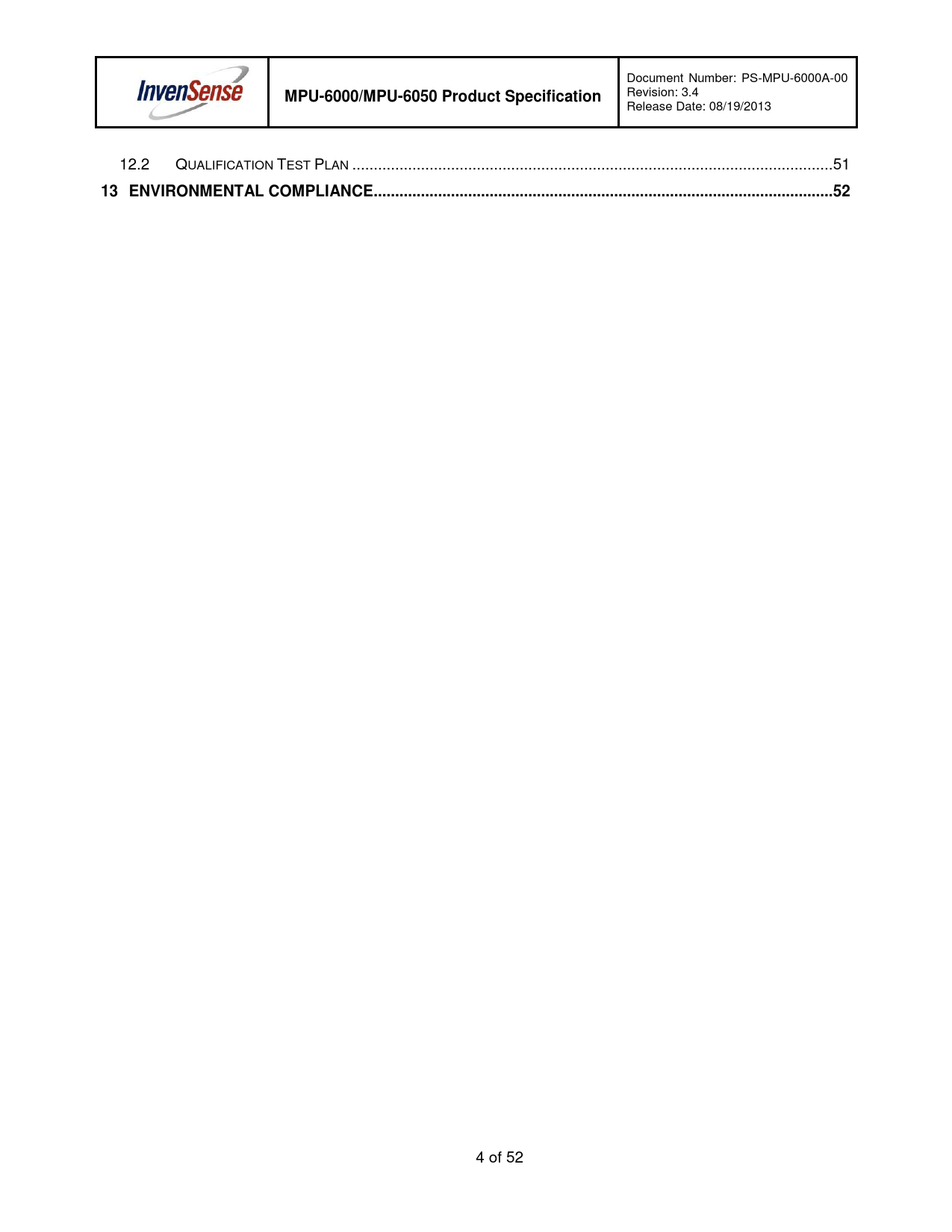 页数 / 页52 / 4 — MPU-6000/MPU-6050 Product Specification. ENVIRONMENTAL COMPLIANCE ... 52