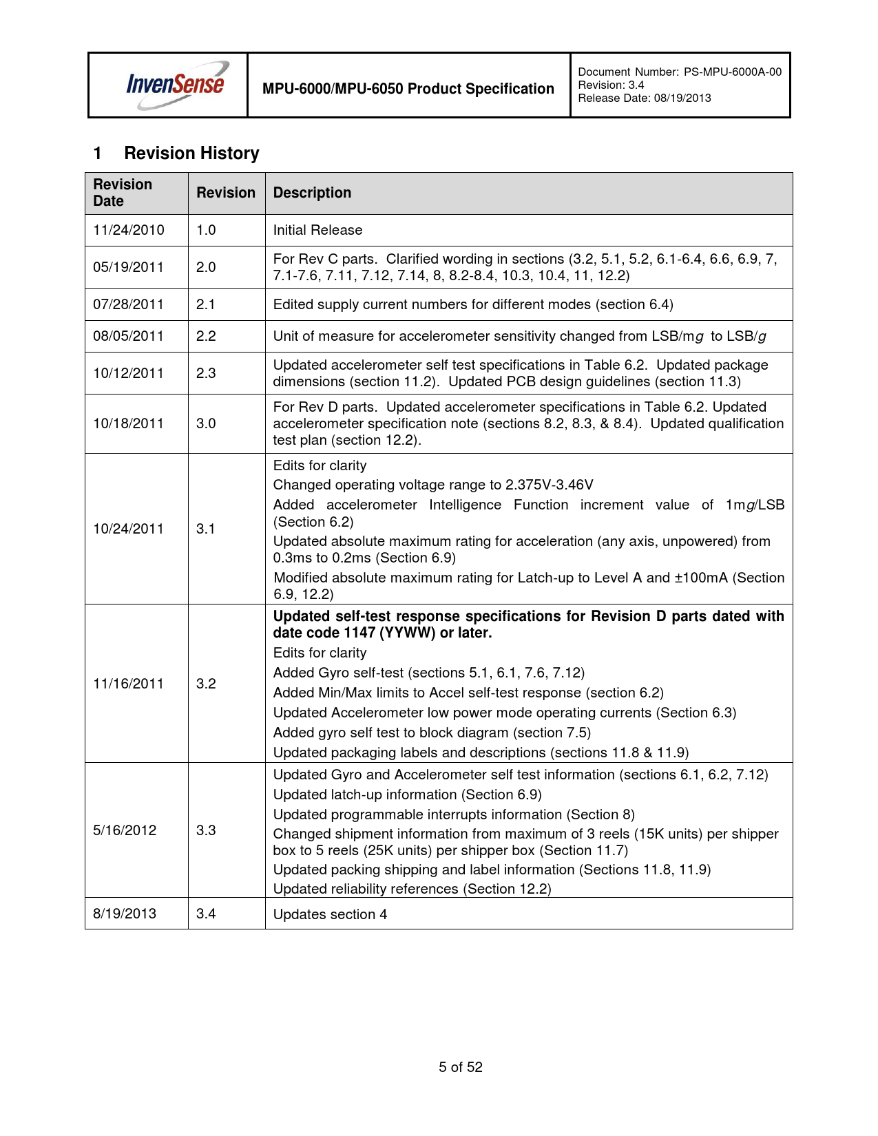 Document Number: PS-MPU-6000A-00 MPU-6000/MPU-6050 Product Specification Revision: 3.4 Release Date: 08/19/2013 1Revision HistoryRevisionRevision DescriptionDate 11/24/2010 1.0 Initial Release For Rev C parts. Clarified wording in sections (3.2, 5.1, 5.2, 6.1-6.4, 6.6, 6.9, 7, 05/19/2011 2.0 7.1-7.6, 7.11, 7.12, 7.14, 8, 8.2-8.4, 10.3, 10.4, 11, 12.2) 07/28/2011 2.1 Edited supply current numbers for different modes (section 6.4) 08/05/2011 2.2 Unit of measure for accelerometer sensitivity changed from LSB/mg to LSB/g Updated accelerometer self test specifications in Table 6.2. Updated package 10/12/2011 2.3 dimensions (section 11.2). Updated PCB design guidelines (section 11.3) For Rev D parts. Updated accelerometer specifications in Table 6.2. Updated 10/18/2011 3.0 accelerometer specification note (sections 8.2, 8.3, & 8.4). Updated qualification test plan (section 12.2). Edits for clarity Changed operating voltage range to 2.375V-3.46V Added accelerometer Intelligence Function increment value of 1mg/LSB (Section 6.2) 10/24/2011 3.1 Updated absolute maximum rating for acceleration (any axis, unpowered) from 0.3ms to 0.2ms (Section 6.9) Modified absolute maximum rating for Latch-up to Level A and ±100mA (Section 6.9, 12.2) Updated self-test response specifications for Revision D parts dated with date code 1147 (YYWW) or later. Edits for clarity Added Gyro self-test (sections 5.1, 6.1, 7.6, 7.12) 11/16/2011 3.2 Added Min/Max limits to Accel self-test response (section 6.2) Updated Accelerometer low power mode operating currents (Section 6.3) Added gyro self test to block diagram (section 7.5) Updated packaging labels and descriptions (sections 11.8 & 11.9) Updated Gyro and Accelerometer self test information (sections 6.1, 6.2, 7.12) Updated latch-up information (Section 6.9) Updated programmable interrupts information (Section 8) 5/16/2012 3.3 Changed shipment information from maximum of 3 reels (15K units) per shipper box to 5 reels (25K units) per shipper box (Section 11.7) Updated packing shipping and label information (Sections 11.8, 11.9) Updated reliability references (Section 12.2) 8/19/2013 3.4 Updates section 4 5 of 52