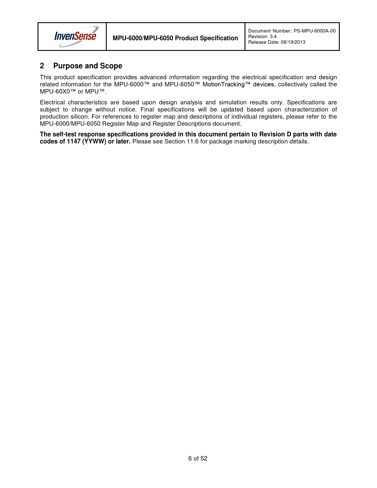 52 /6 — MPU-6000/MPU-6050 Product Specification. Purpose and Scope