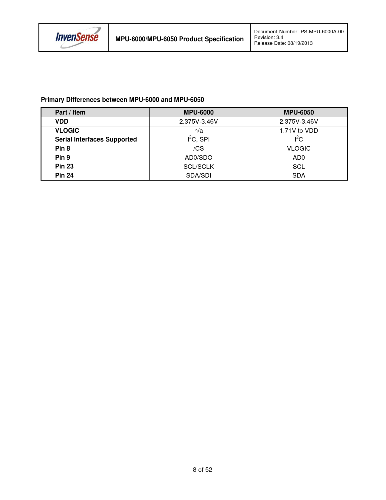 52 /8 — MPU-6000/MPU-6050 Product Specification. Primary Differences between …