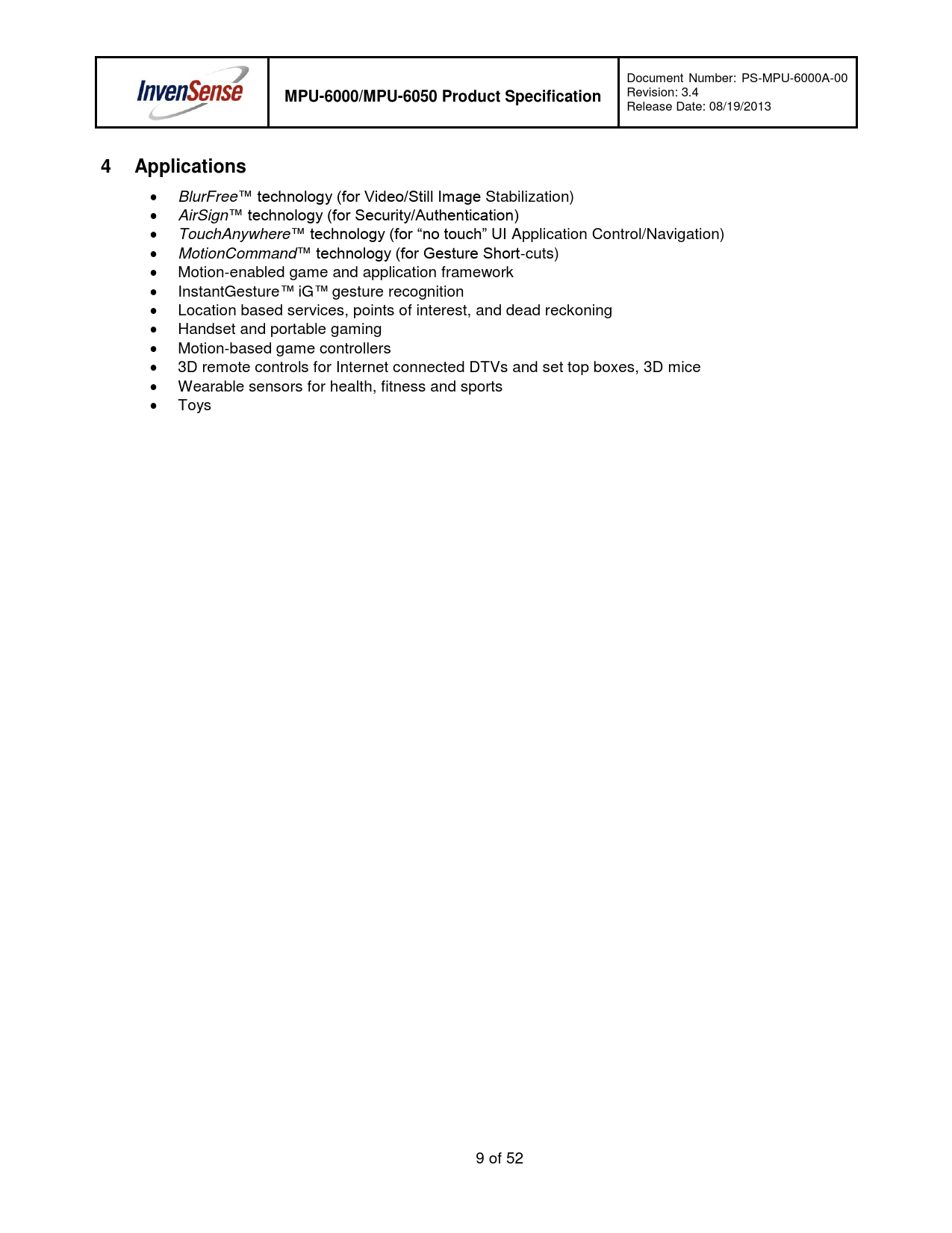 页数 / 页52 / 9 — MPU-6000/MPU-6050 Product Specification. Applications