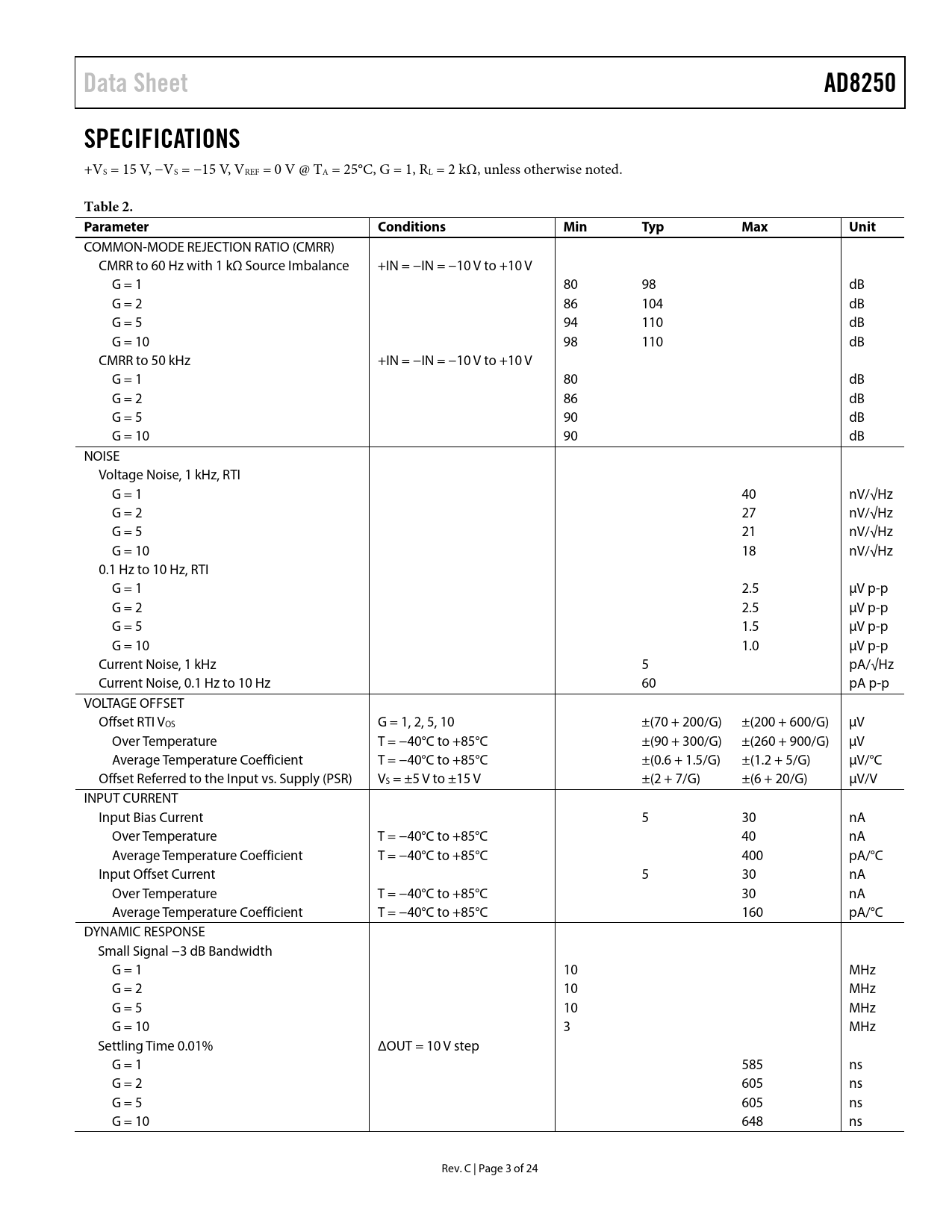 Data SheetAD8250SPECIFICATIONS +VS = 15 V, −VS = −15 V, VREF = 0 V @ TA = 25°C, G = 1, RL = 2 kΩ, unless otherwise noted. Table 2. ParameterConditionsMinTypMaxUnit COMMON-MODE REJECTION RATIO (CMRR) CMRR to 60 Hz with 1 kΩ Source Imbalance +IN = −IN = −10 V to +10 V G = 1 80 98 dB G = 2 86 104 dB G = 5 94 110 dB G = 10 98 110 dB CMRR to 50 kHz +IN = −IN = −10 V to +10 V G = 1 80 dB G = 2 86 dB G = 5 90 dB G = 10 90 dB NOISE Voltage Noise, 1 kHz, RTI G = 1 40 nV/√Hz G = 2 27 nV/√Hz G = 5 21 nV/√Hz G = 10 18 nV/√Hz 0.1 Hz to 10 Hz, RTI G = 1 2.5 μV p-p G = 2 2.5 μV p-p G = 5 1.5 μV p-p G = 10 1.0 μV p-p Current Noise, 1 kHz 5 pA/√Hz Current Noise, 0.1 Hz to 10 Hz 60 pA p-p VOLTAGE OFFSET Offset RTI VOS G = 1, 2, 5, 10 ±(70 + 200/G) ±(200 + 600/G) μV Over Temperature T = −40°C to +85°C ±(90 + 300/G) ±(260 + 900/G) μV Average Temperature Coefficient T = −40°C to +85°C ±(0.6 + 1.5/G) ±(1.2 + 5/G) μV/°C Offset Referred to the Input vs. Supply (PSR) VS = ±5 V to ±15 V ±(2 + 7/G) ±(6 + 20/G) μV/V INPUT CURRENT Input Bias Current 5 30 nA Over Temperature T = −40°C to +85°C 40 nA Average Temperature Coefficient T = −40°C to +85°C 400 pA/°C Input Offset Current 5 30 nA Over Temperature T = −40°C to +85°C 30 nA Average Temperature Coefficient T = −40°C to +85°C 160 pA/°C DYNAMIC RESPONSE Small Signal −3 dB Bandwidth G = 1 10 MHz G = 2 10 MHz G = 5 10 MHz G = 10 3 MHz Settling Time 0.01% ΔOUT = 10 V step G = 1 585 ns G = 2 605 ns G = 5 605 ns G = 10 648 ns Rev. C | Page 3 of 24 Document Outline Features Applications General Description Functional Block Diagram Revision History Specifications Timing Diagram Absolute Maximum Ratings Maximum Power Dissipation ESD Caution Pin Configuration and Function Descriptions Typical Performance Characteristics Theory of Operation Gain Selection Transparent Gain Mode Latched Gain Mode Timing for Latched Gain Mode Power Supply Regulation and Bypassing Input Bias Current Return Path Input Protection Reference Terminal Common-Mode Input Voltage Range Layout Grounding Coupling Noise Common-Mode Rejection RF Interference Driving an ADC Applications Differential Output Setting Gains with a Microcontroller Data Acquisition Outline Dimensions Ordering Guide