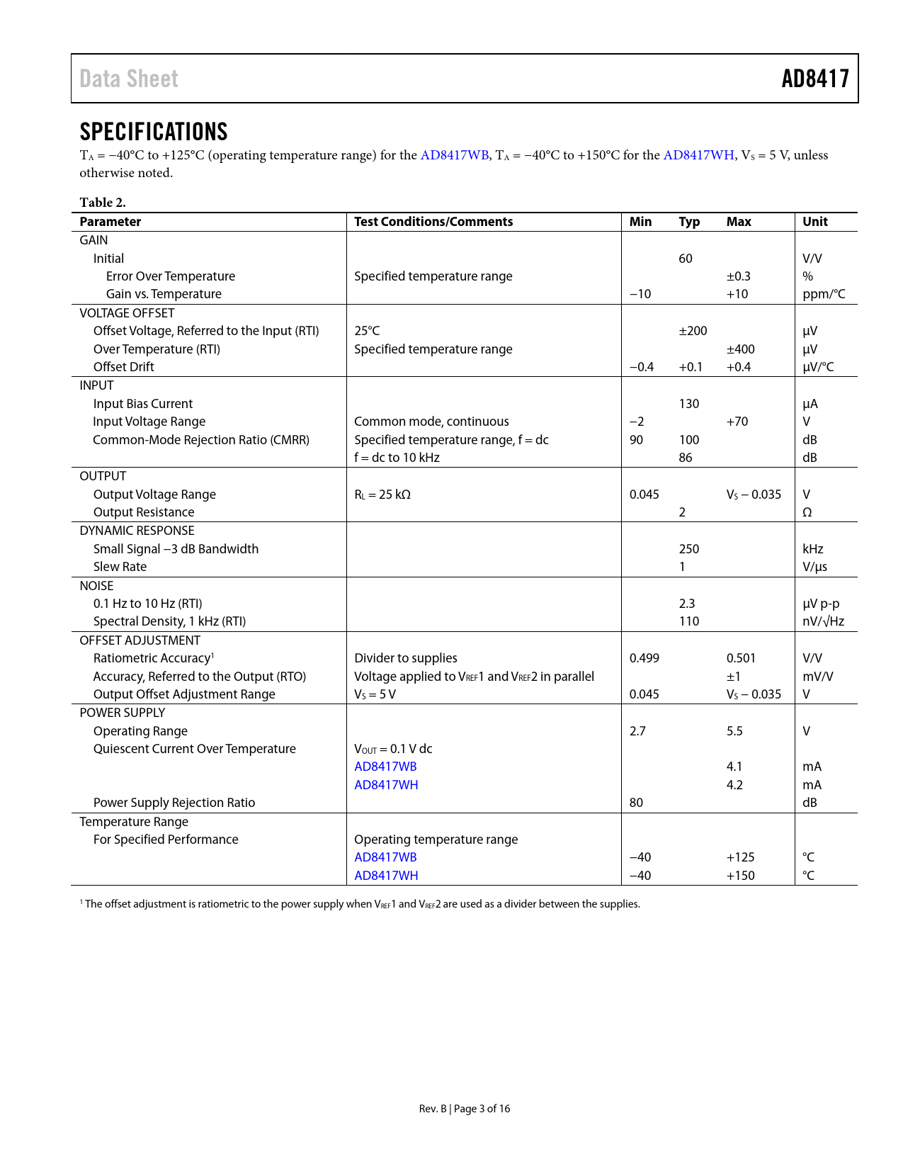 Data Sheet. AD8417. SPECIFICATIONS. Table 2. Parameter. Test Conditions/Comments. Min. Typ. Max. Unit