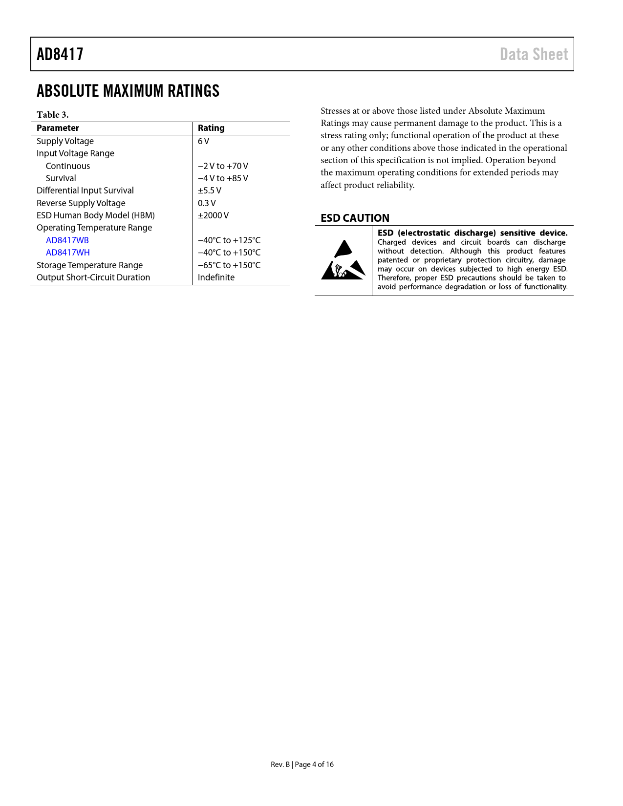 AD8417. Data Sheet. ABSOLUTE MAXIMUM RATINGS Table 3. Parameter. Rating. ESD CAUTION