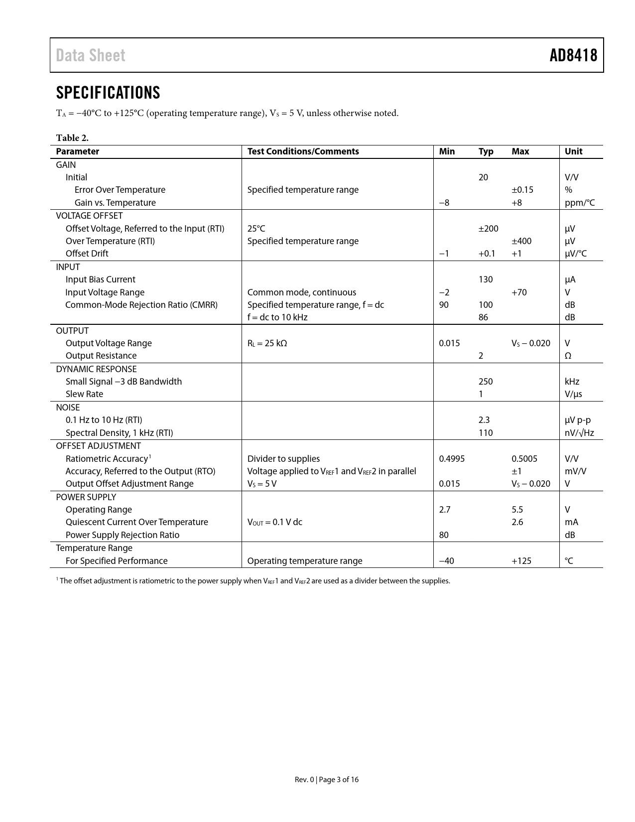 link to page 4 Data SheetAD8418SPECIFICATIONS TA = −40°C to +125°C (operating temperature range), VS = 5 V, unless otherwise noted. Table 2. ParameterTest Conditions/CommentsMinTypMaxUnit GAIN Initial 20 V/V Error Over Temperature Specified temperature range ±0.15 % Gain vs. Temperature −8 +8 ppm/°C VOLTAGE OFFSET Offset Voltage, Referred to the Input (RTI) 25°C ±200 µV Over Temperature (RTI) Specified temperature range ±400 µV Offset Drift −1 +0.1 +1 µV/°C INPUT Input Bias Current 130 µA Input Voltage Range Common mode, continuous −2 +70 V Common-Mode Rejection Ratio (CMRR) Specified temperature range, f = dc 90 100 dB f = dc to 10 kHz 86 dB OUTPUT Output Voltage Range RL = 25 kΩ 0.015 VS − 0.020 V Output Resistance 2 Ω DYNAMIC RESPONSE Small Signal −3 dB Bandwidth 250 kHz Slew Rate 1 V/µs NOISE 0.1 Hz to 10 Hz (RTI) 2.3 µV p-p Spectral Density, 1 kHz (RTI) 110 nV/√Hz OFFSET ADJUSTMENT Ratiometric Accuracy1 Divider to supplies 0.4995 0.5005 V/V Accuracy, Referred to the Output (RTO) Voltage applied to VREF1 and VREF2 in parallel ±1 mV/V Output Offset Adjustment Range VS = 5 V 0.015 VS − 0.020 V POWER SUPPLY Operating Range 2.7 5.5 V Quiescent Current Over Temperature VOUT = 0.1 V dc 2.6 mA Power Supply Rejection Ratio 80 dB Temperature Range For Specified Performance Operating temperature range −40 +125 °C 1 The offset adjustment is ratiometric to the power supply when VREF1 and VREF2 are used as a divider between the supplies. Rev. 0 | Page 3 of 16 Document Outline Features Applications General Description Functional Block Diagram Table of Contents Revision History Specifications Absolute Maximum Ratings ESD Caution Pin Configuration and Function Descriptions Typical Performance Characteristics Theory of Operation Output Offset Adjustment Unidirectional Operation Ground Referenced Output VS Referenced Output Bidirectional Operation External Referenced Output Splitting the Supply Splitting an External Reference Applications Information Motor Control 3-Phase Motor Control H-Bridge Motor Control Solenoid Control High-Side Current Sense with a Low-Side Switch High-Side Current Sense with a High-Side Switch High Rail Current Sensing Outline Dimensions Ordering Guide Automotive Products