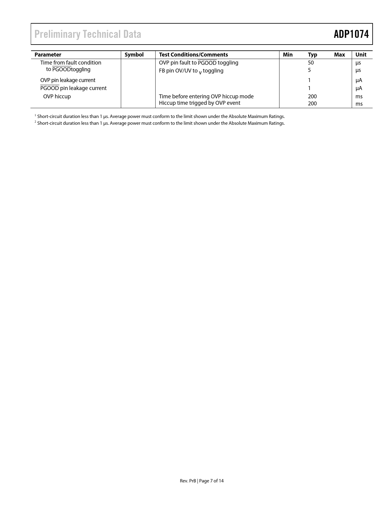 页数 / 页14 / 7 — Preliminary Technical Data. ADP1074. Parameter. Symbol. Test …