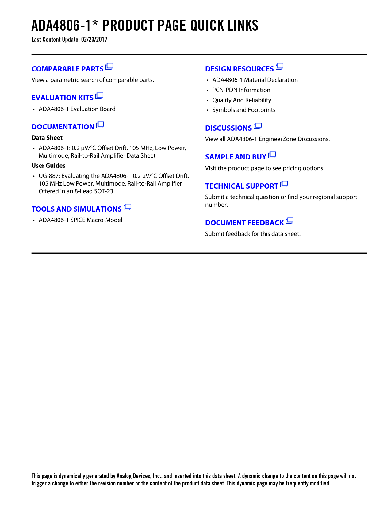 ADA4806-1* PRODUCT PAGE QUICK LINKS Last Content Update: 02/23/2017COMPARABLE PARTSDESIGN RESOURCES View a parametric search of comparable parts. • ADA4806-1 Material Declaration • PCN-PDN Information EVALUATION KITS • Quality And Reliability • ADA4806-1 Evaluation Board • Symbols and Footprints DOCUMENTATIONDISCUSSIONSData Sheet View all ADA4806-1 EngineerZone Discussions. • ADA4806-1: 0.2 μV/°C Offset Drift, 105 MHz, Low Power, Multimode, Rail-to-Rail Amplifier Data Sheet SAMPLE AND BUYUser Guides Visit the product page to see pricing options. • UG-887: Evaluating the ADA4806-1 0.2 μV/°C Offset Drift, 105 MHz Low Power, Multimode, Rail-to-Rail Amplifier TECHNICAL SUPPORT Offered in an 8-Lead SOT-23 Submit a technical question or find your regional support number. TOOLS AND SIMULATIONS • ADA4806-1 SPICE Macro-Model DOCUMENT FEEDBACK Submit feedback for this data sheet. This page is dynamically generated by Analog Devices, Inc., and inserted into this data sheet. A dynamic change to the content on this page will not trigger a change to either the revision number or the content of the product data sheet. This dynamic page may be frequently modified. Document Outline FEATURES APPLICATIONS GENERAL DESCRIPTION TYPICAL APPLICATIONS CIRCUIT TABLE OF CONTENTS REVISION HISTORY SPECIFICATIONS ±5 V SUPPLY 5 V SUPPLY 3 V SUPPLY ABSOLUTE MAXIMUM RATINGS THERMAL RESISTANCE MAXIMUM POWER DISSIPATION ESD CAUTION PIN CONFIGURATION AND FUNCTION DESCRIPTIONS TYPICAL PERFORMANCE CHARACTERISTICS TEST CIRCUITS THEORY OF OPERATION AMPLIFIER DESCRIPTION INPUT PROTECTION SHUTDOWN/SLEEP MODE OPERATION NOISE CONSIDERATIONS APPLICATIONS INFORMATION SLEW ENHANCEMENT EFFECT OF FEEDBACK RESISTOR ON FREQUENCY RESPONSE COMPENSATING PEAKING IN LARGE SIGNAL FREQUENCY RESPONSE DRIVING LOW POWER, HIGH RESOLUTION SUCCESSIVE APPROXIMATION REGISTER (SAR) ADCs DYNAMIC POWER SCALING SINGLE-ENDED TO DIFFERENTIAL CONVERSION LAYOUT CONSIDERATIONS Ground Plane Power Supply Bypassing OUTLINE DIMENSIONS ORDERING GUIDE