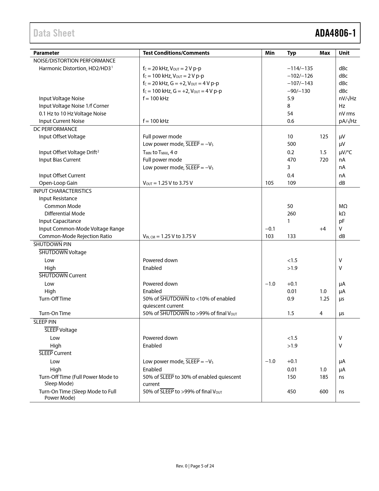 link to page 7 link to page 7 Data SheetADA4806-1ParameterTest Conditions/CommentsMinTypMaxUnit NOISE/DISTORTION PERFORMANCE Harmonic Distortion, HD2/HD31 fC = 20 kHz, VOUT = 2 V p-p −114/−135 dBc fC = 100 kHz, VOUT = 2 V p-p −102/−126 dBc fC = 20 kHz, G = +2, VOUT = 4 V p-p −107/−143 dBc fC = 100 kHz, G = +2, VOUT = 4 V p-p −90/−130 dBc Input Voltage Noise f = 100 kHz 5.9 nV/√Hz Input Voltage Noise 1/f Corner 8 Hz 0.1 Hz to 10 Hz Voltage Noise 54 nV rms Input Current Noise f = 100 kHz 0.6 pA/√Hz DC PERFORMANCE Input Offset Voltage Full power mode 10 125 µV Low power mode, SLEEP = −VS 500 µV Input Offset Voltage Drift2 TMIN to TMAX, 4 σ 0.2 1.5 µV/°C Input Bias Current Full power mode 470 720 nA Low power mode, SLEEP = −VS 3 nA Input Offset Current 0.4 nA Open-Loop Gain VOUT = 1.25 V to 3.75 V 105 109 dB INPUT CHARACTERISTICS Input Resistance Common Mode 50 MΩ Differential Mode 260 kΩ Input Capacitance 1 pF Input Common-Mode Voltage Range −0.1 +4 V Common-Mode Rejection Ratio VIN, CM = 1.25 V to 3.75 V 103 133 dB SHUTDOWN PIN SHUTDOWN Voltage Low Powered down <1.5 V High Enabled >1.9 V SHUTDOWN Current Low Powered down −1.0 +0.1 µA High Enabled 0.01 1.0 µA Turn-Off Time 50% of SHUTDOWN to <10% of enabled 0.9 1.25 µs quiescent current Turn-On Time 50% of SHUTDOWN to >99% of final VOUT 1.5 4 µs SLEEP PIN SLEEP Voltage Low Powered down <1.5 V High Enabled >1.9 V SLEEP Current Low Low power mode, SLEEP = −VS −1.0 +0.1 µA High Enabled 0.01 1.0 µA Turn-Off Time (Full Power Mode to 50% of SLEEP to 30% of enabled quiescent 150 185 ns Sleep Mode) current Turn-On Time (Sleep Mode to Full 50% of SLEEP to >99% of final VOUT 450 600 ns Power Mode) Rev. 0 | Page 5 of 24 Document Outline FEATURES APPLICATIONS GENERAL DESCRIPTION TYPICAL APPLICATIONS CIRCUIT TABLE OF CONTENTS REVISION HISTORY SPECIFICATIONS ±5 V SUPPLY 5 V SUPPLY 3 V SUPPLY ABSOLUTE MAXIMUM RATINGS THERMAL RESISTANCE MAXIMUM POWER DISSIPATION ESD CAUTION PIN CONFIGURATION AND FUNCTION DESCRIPTIONS TYPICAL PERFORMANCE CHARACTERISTICS TEST CIRCUITS THEORY OF OPERATION AMPLIFIER DESCRIPTION INPUT PROTECTION SHUTDOWN/SLEEP MODE OPERATION NOISE CONSIDERATIONS APPLICATIONS INFORMATION SLEW ENHANCEMENT EFFECT OF FEEDBACK RESISTOR ON FREQUENCY RESPONSE COMPENSATING PEAKING IN LARGE SIGNAL FREQUENCY RESPONSE DRIVING LOW POWER, HIGH RESOLUTION SUCCESSIVE APPROXIMATION REGISTER (SAR) ADCs DYNAMIC POWER SCALING SINGLE-ENDED TO DIFFERENTIAL CONVERSION LAYOUT CONSIDERATIONS Ground Plane Power Supply Bypassing OUTLINE DIMENSIONS ORDERING GUIDE