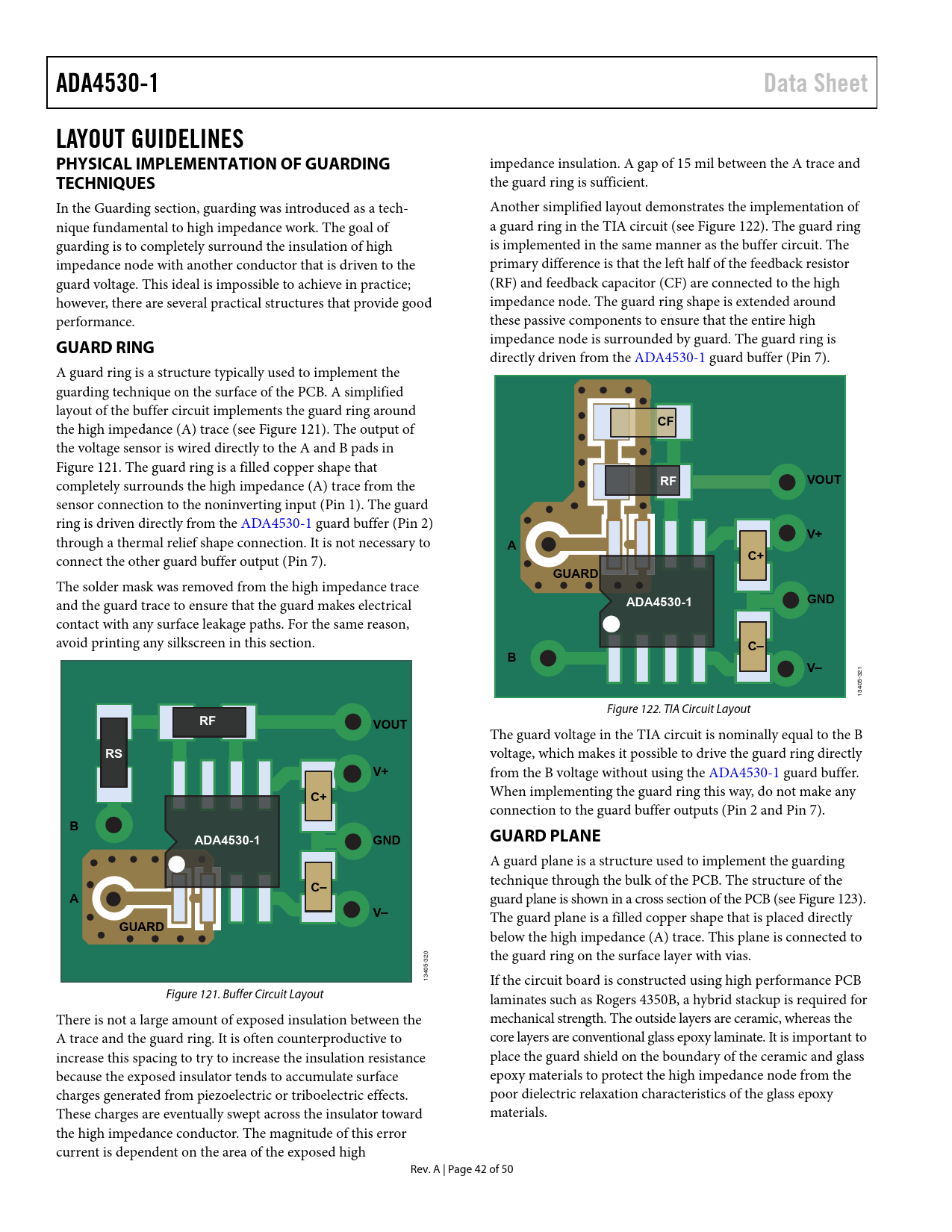 link to page 35 link to page 43 link to page 43 link to page 43 link to page 44 ADA4530-1Data SheetLAYOUT GUIDELINES PHYSICAL IMPLEMENTATION OF GUARDING impedance insulation. A gap of 15 mil between the A trace and TECHNIQUES the guard ring is sufficient. In the Guarding section, guarding was introduced as a tech- Another simplified layout demonstrates the implementation of nique fundamental to high impedance work. The goal of a guard ring in the TIA circuit (see Figure 122). The guard ring guarding is to completely surround the insulation of high is implemented in the same manner as the buffer circuit. The impedance node with another conductor that is driven to the primary difference is that the left half of the feedback resistor guard voltage. This ideal is impossible to achieve in practice; (RF) and feedback capacitor (CF) are connected to the high however, there are several practical structures that provide good impedance node. The guard ring shape is extended around performance. these passive components to ensure that the entire high impedance node is surrounded by guard. The guard ring is GUARD RING directly driven from the ADA4530-1 guard buffer (Pin 7). A guard ring is a structure typically used to implement the guarding technique on the surface of the PCB. A simplified layout of the buffer circuit implements the guard ring around CF the high impedance (A) trace (see Figure 121). The output of the voltage sensor is wired directly to the A and B pads in Figure 121. The guard ring is a filled copper shape that RFVOUT completely surrounds the high impedance (A) trace from the sensor connection to the noninverting input (Pin 1). The guard ring is driven directly from the ADA4530-1 guard buffer (Pin 2) V+ through a thermal relief shape connection. It is not necessary to A connect the other guard buffer output (Pin 7). C+GUARD The solder mask was removed from the high impedance trace GND and the guard trace to ensure that the guard makes electrical ADA4530-1 contact with any surface leakage paths. For the same reason, avoid printing any silkscreen in this section. C–BV– 1 32 5- 340 1 Figure 122. TIA Circuit Layout RFVOUT The guard voltage in the TIA circuit is nominally equal to the B RS voltage, which makes it possible to drive the guard ring directly V+ from the B voltage without using the ADA4530-1 guard buffer. C+ When implementing the guard ring this way, do not make any connection to the guard buffer outputs (Pin 2 and Pin 7). BADA4530-1GNDGUARD PLANE A guard plane is a structure used to implement the guarding C– technique through the bulk of the PCB. The structure of the A guard plane is shown in a cross section of the PCB (see Figure 123). V– The guard plane is a filled copper shape that is placed directly GUARD below the high impedance (A) trace. This plane is connected to the guard ring on the surface layer with vias. -320 405 13 If the circuit board is constructed using high performance PCB Figure 121. Buffer Circuit Layout laminates such as Rogers 4350B, a hybrid stackup is required for There is not a large amount of exposed insulation between the mechanical strength. The outside layers are ceramic, whereas the A trace and the guard ring. It is often counterproductive to core layers are conventional glass epoxy laminate. It is important to increase this spacing to try to increase the insulation resistance place the guard shield on the boundary of the ceramic and glass because the exposed insulator tends to accumulate surface epoxy materials to protect the high impedance node from the charges generated from piezoelectric or triboelectric effects. poor dielectric relaxation characteristics of the glass epoxy These charges are eventually swept across the insulator toward materials. the high impedance conductor. The magnitude of this error current is dependent on the area of the exposed high Rev. A | Page 42 of 50 Document Outline FEATURES APPLICATIONS PIN CONNECTION DIAGRAM GENERAL DESCRIPTION TABLE OF CONTENTS REVISION HISTORY SPECIFICATIONS 5 V NOMINAL ELECTRICAL CHARACTERISTICS 10 V NOMINAL ELECTRICAL CHARACTERISTICS 15 V NOMINAL ELECTRICAL CHARACTERISTICS ABSOLUTE MAXIMUM RATINGS THERMAL RESISTANCE ESD CAUTION PIN CONFIGURATION AND FUNCTION DESCRIPTIONS TYPICAL PERFORMANCE CHARACTERISTICS MAIN AMPLIFIER, DC PERFORMANCE MAIN AMPLIFIER, AC PERFORMANCE GUARD AMPLIFIER THEORY OF OPERATION ESD STRUCTURE INPUT STAGE GAIN STAGE OUTPUT STAGE GUARD BUFFER APPLICATIONS INFORMATION INPUT PROTECTION SINGLE-SUPPLY AND RAIL-TO-RAIL OUTPUT CAPACITIVE LOAD STABILITY EMI REJECTION RATIO HIGH IMPEDANCE MEASUREMENTS INPUT BIAS CURRENT INPUT RESISTANCE INPUT OFFSET VOLTAGE INSULATION RESISTANCE GUARDING DIELECTRIC RELAXATION HUMIDITY EFFECTS CONTAMINATION CLEANING AND HANDLING SOLDER PASTE SELECTION CURRENT NOISE CONSIDERATIONS LAYOUT GUIDELINES PHYSICAL IMPLEMENTATION OF GUARDING TECHNIQUES GUARD RING GUARD PLANE VIA FENCE CABLES AND CONNECTORS ELECTROSTATIC INTERFERANCE PHOTODIODE INTERFACE DC ERROR ANALYSIS AC ERROR ANALYSIS NOISE ANALYSIS DESIGN RECOMMENDATIONS DESIGN EXAMPLE POWER SUPPLY RECOMMENDATIONS POWER SUPPLY CONSIDERATIONS OUTLINE DIMENSIONS ORDERING GUIDE