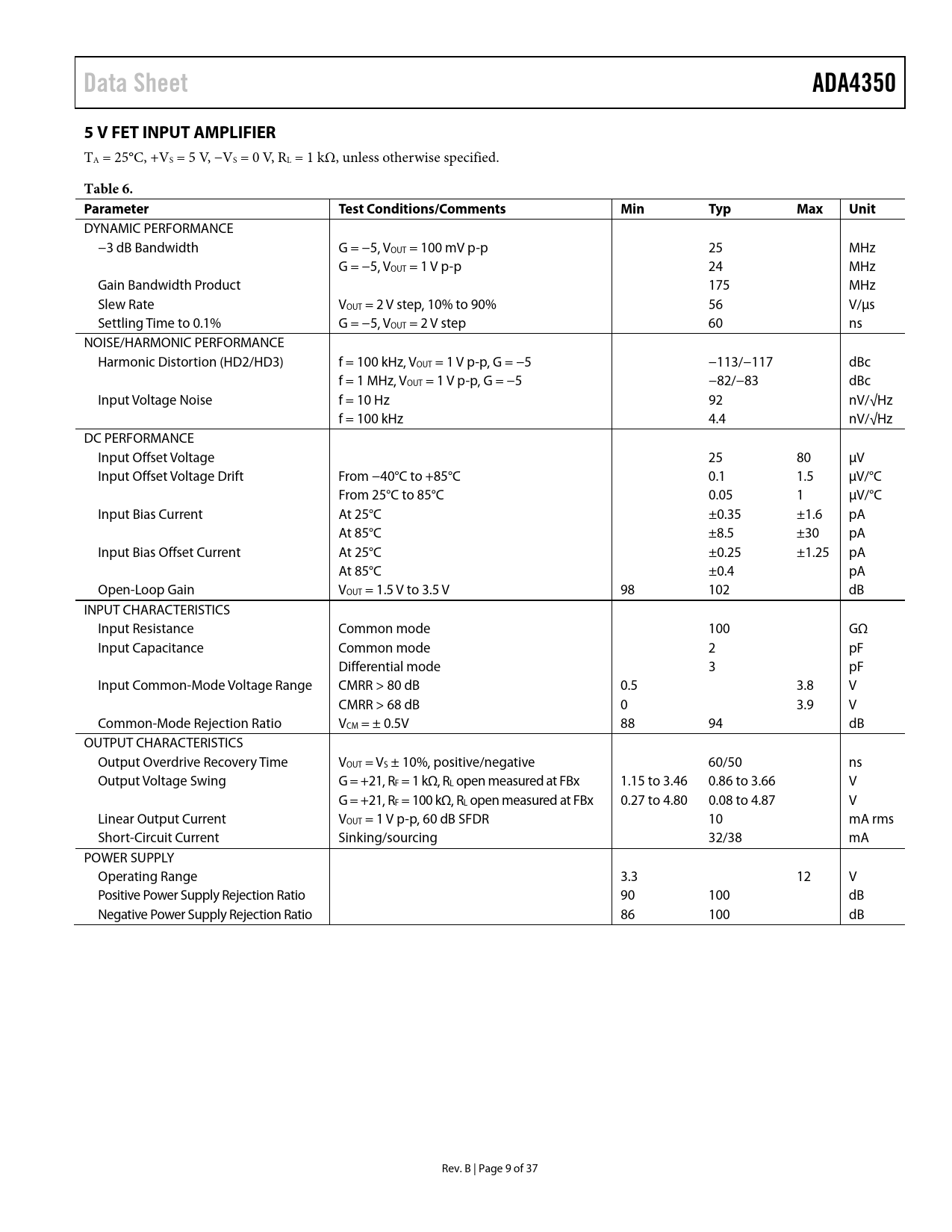 Data Sheet ADA4350 5 V FET INPUT AMPLIFIER Table 6 Parameter Test Conditions/Comments Min Typ Max Unit