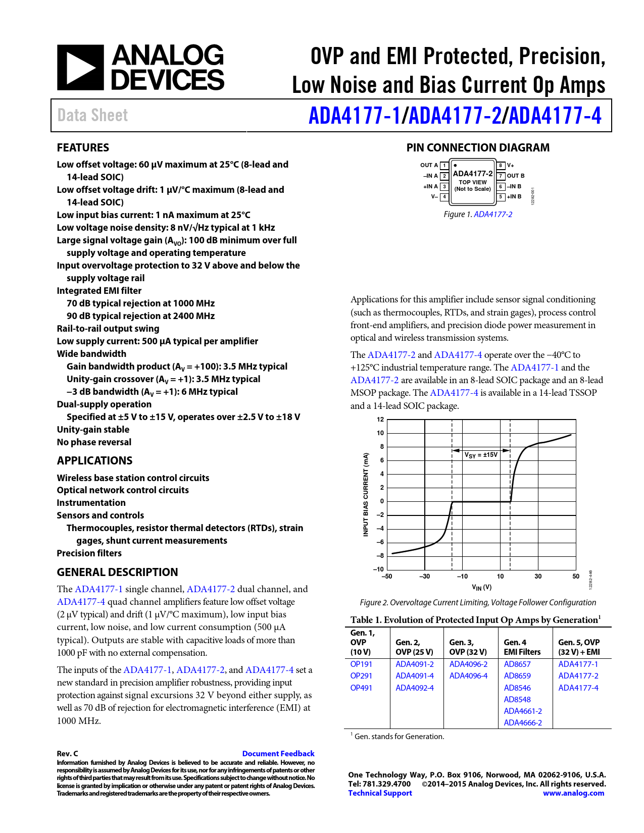 OVP and EMI Protected, Precision,. Low Noise and Bias Current Op Amps. Data Sheet. ADA4177-1. /ADA4177-2/. ADA4177-4. FEATURES