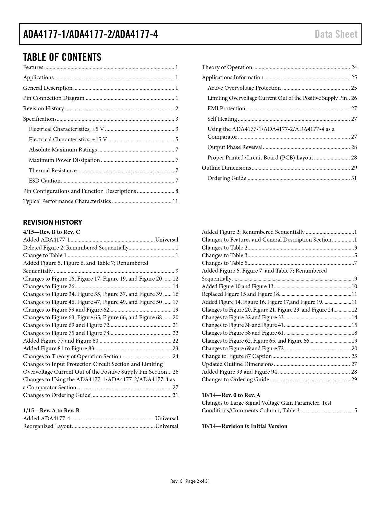link to page 1 link to page 1 link to page 1 link to page 1 link to page 2 link to page 3 link to page 3 link to page 5 link to page 7 link to page 7 link to page 7 link to page 7 link to page 8 link to page 11 link to page 24 link to page 25 link to page 25 link to page 26 link to page 27 link to page 27 link to page 27 link to page 27 link to page 28 link to page 28 link to page 29 link to page 31 ADA4177-1/ADA4177-2/ADA4177-4Data SheetTABLE OF CONTENTS Features .. 1 Theory of Operation .. 24 Applications ... 1 Applications Information .. 25 General Description ... 1 Active Overvoltage Protection ... 25 Pin Connection Diagram .. 1 Limiting Overvoltage Current Out of the Positive Supply Pin .. 26 Revision History ... 2 EMI Protection ... 27 Specifications ... 3 Self Heating ... 27 Electrical Characteristics, ±5 V .. 3 Using the ADA4177-1/ADA4177-2/ADA4177-4 as a Electrical Characteristics, ±15 V .. 5 Comparator ... 27 Absolute Maximum Ratings ... 7 Output Phase Reversal ... 28 Maximum Power Dissipation ... 7 Proper Printed Circuit Board (PCB) Layout .. 28 Thermal Resistance .. 7 Outline Dimensions ... 29 ESD Caution .. 7 Ordering Guide .. 31 Pin Configurations and Function Descriptions ... 8 Typical Performance Characteristics ... 11 REVISION HISTORY4/15—Rev. B to Rev. C Added Figure 2; Renumbered Sequentially ... 1 Added ADA4177-1 ... Universal Changes to Features and General Description Section .. 1 Deleted Figure 2; Renumbered Sequentially ... 1 Changes to Table 2 ... 3 Change to Table 1 ... 1 Changes to Table 3 ... 5 Added Figure 5, Figure 6, and Table 7; Renumbered Changes to Table 5 ... 7 Sequentially ... 9 Added Figure 6, Figure 7, and Table 7; Renumbered Changes to Figure 16, Figure 17, Figure 19, and Figure 20 .. 12 Sequentially .. 9 Changes to Figure 26 .. 14 Added Figure 10 and Figure 13 ... 10 Changes to Figure 34, Figure 35, Figure 37, and Figure 39 .. 16 Replaced Figure 15 and Figure 18 ... 11 Changes to Figure 46, Figure 47, Figure 49, and Figure 50 .. 17 Added Figure 14, Figure 16, Figure 17,and Figure 19 ... 11 Changes to Figure 59 and Figure 62... 19 Changes to Figure 20, Figure 21, Figure 23, and Figure 24 .. 12 Changes to Figure 63, Figure 65, Figure 66, and Figure 68 .. 20 Changes to Figure 32 and Figure 33 ... 14 Changes to Figure 69 and Figure 72... 21 Changes to Figure 38 and Figure 41 ... 15 Changes to Figure 75 and Figure 78... 22 Changes to Figure 58 and Figure 61 ... 18 Added Figure 77 and Figure 80 .. 22 Changes to Figure 62, Figure 65, and Figure 66 ... 19 Added Figure 81 to Figure 83 ... 23 Changes to Figure 69 and Figure 72 ... 20 Changes to Theory of Operation Section .. 24 Change to Figure 87 Caption .. 25 Changes to Input Protection Circuit Section and Limiting Updated Outline Dimensions ... 27 Overvoltage Current Out of the Positive Supply Pin Section ... 26 Added Figure 93 and Figure 94 .. 28 Changes to Using the ADA4177-1/ADA4177-2/ADA4177-4 as Changes to Ordering Guide .. 29 a Comparator Section .. 27 Changes to Ordering Guide .. 31 10/14—Rev. 0 to Rev. A Changes to Large Signal Voltage Gain Parameter, Test 1/15—Rev. A to Rev. B Conditions/Comments Column, Table 3 ... 5 Added ADA4177-4 ... Universal Reorganized Layout .. Universal 10/14—Revision 0: Initial Version Rev. C | Page 2 of 31 Document Outline FEATURES APPLICATIONS GENERAL DESCRIPTION PIN CONNECTION DIAGRAM TABLE OF CONTENTS REVISION HISTORY SPECIFICATIONS ELECTRICAL CHARACTERISTICS, ±5 V ELECTRICAL CHARACTERISTICS, ±15 V ABSOLUTE MAXIMUM RATINGS MAXIMUM POWER DISSIPATION THERMAL RESISTANCE ESD CAUTION PIN CONFIGURATIONS AND FUNCTION DESCRIPTIONS TYPICAL PERFORMANCE CHARACTERISTICS THEORY OF OPERATION APPLICATIONS INFORMATION ACTIVE OVERVOLTAGE PROTECTION Common Protection Methods Add an External Series Input Resistor Add External Clamping Diodes Input Protection Circuit LIMITING OVERVOLTAGE CURRENT OUT OF THE POSITIVE SUPPLY PIN EMI PROTECTION SELF HEATING USING THE ADA4177-1/ADA4177-2/ADA4177-4 AS A COMPARATOR OUTPUT PHASE REVERSAL PROPER PRINTED CIRCUIT BOARD (PCB) LAYOUT OUTLINE DIMENSIONS ORDERING GUIDE
