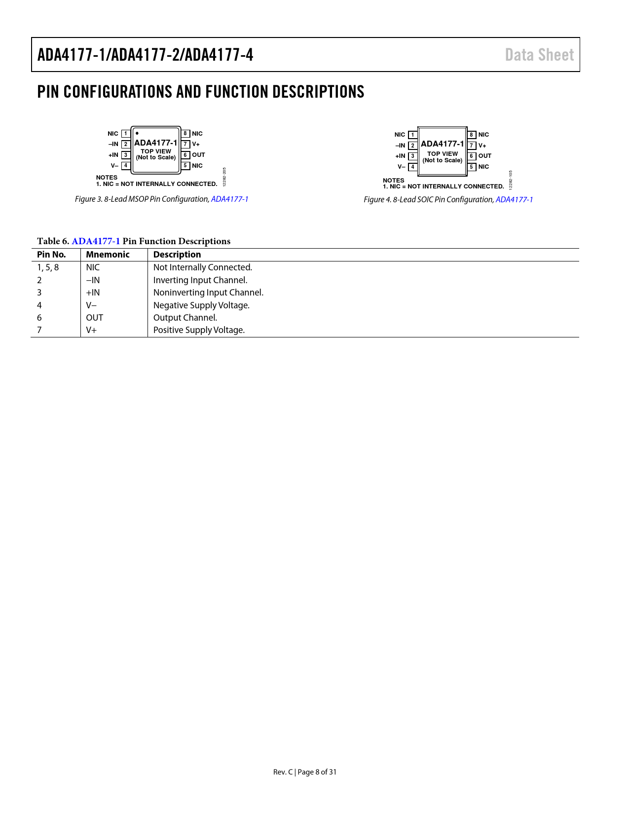 ADA4177-1/ADA4177-2/ADA4177-4. Data Sheet. PIN CONFIGURATIONS AND FUNCTION DESCRIPTIONS. NIC. –IN. ADA4177-1 7 V+. TOP VIEW. +IN. OUT