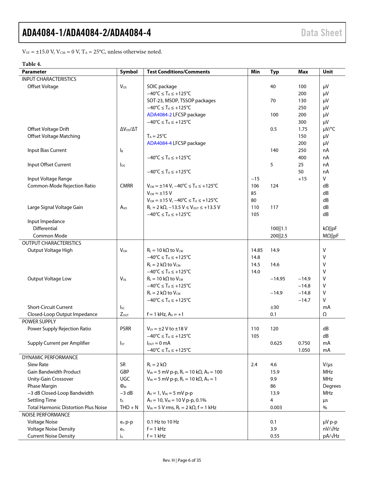 ADA4084-1/ADA4084-2/ADA4084-4Data Sheet VSY = ±15.0 V, VCM = 0 V, TA = 25°C, unless otherwise noted. Table 4. ParameterSymbolTest Conditions/CommentsMinTypMaxUnit INPUT CHARACTERISTICS Offset Voltage VOS SOIC package 40 100 µV −40°C ≤ TA ≤ +125°C 200 µV SOT-23, MSOP, TSSOP packages 70 130 µV −40°C ≤ TA ≤ +125°C 250 µV ADA4084-2 LFCSP package 100 200 µV −40°C ≤ TA ≤ +125°C 300 µV Offset Voltage Drift ΔVOS/ΔT 0.5 1.75 µV/°C Offset Voltage Matching TA = 25°C 150 µV ADA4084-4 LFCSP package 200 µV Input Bias Current IB 140 250 nA −40°C ≤ TA ≤ +125°C 400 nA Input Offset Current IOS 5 25 nA −40°C ≤ TA ≤ +125°C 50 nA Input Voltage Range −15 +15 V Common-Mode Rejection Ratio CMRR VCM = ±14 V, −40°C ≤ TA ≤ +125°C 106 124 dB VCM = ±15 V 85 dB VCM = ±15 V, −40°C ≤ TA ≤ +125°C 80 dB Large Signal Voltage Gain AVO RL = 2 kΩ, −13.5 V ≤ VOUT ≤ +13.5 V 110 117 dB −40°C ≤ TA ≤ +125°C 105 dB Input Impedance Differential 100||1.1 kΩ||pF Common Mode 200||2.5 MΩ||pF OUTPUT CHARACTERISTICS Output Voltage High VOH RL = 10 kΩ to VCM 14.85 14.9 V −40°C ≤ TA ≤ +125°C 14.8 V RL = 2 kΩ to VCM 14.5 14.6 V −40°C ≤ TA ≤ +125°C 14.0 V Output Voltage Low VOL RL = 10 kΩ to VCM −14.95 −14.9 V −40°C ≤ TA ≤ +125°C −14.8 V RL = 2 kΩ to VCM −14.9 −14.8 V −40°C ≤ TA ≤ +125°C −14.7 V Short-Circuit Current ISC ±30 mA Closed-Loop Output Impedance ZOUT f = 1 kHz, AV = +1 0.1 Ω POWER SUPPLY Power Supply Rejection Ratio PSRR VSY = ±2 V to ±18 V 110 120 dB −40°C ≤ TA ≤ +125°C 105 dB Supply Current per Amplifier ISY IOUT = 0 mA 0.625 0.750 mA −40°C ≤ TA ≤ +125°C 1.050 mA DYNAMIC PERFORMANCE Slew Rate SR RL = 2 kΩ 2.4 4.6 V/µs Gain Bandwidth Product GBP VIN = 5 mV p-p, RL = 10 kΩ, AV = 100 15.9 MHz Unity-Gain Crossover UGC VIN = 5 mV p-p, RL = 10 kΩ, AV = 1 9.9 MHz Phase Margin ΦM 86 Degrees −3 dB Closed-Loop Bandwidth −3 dB AV = 1, VIN = 5 mV p-p 13.9 MHz Settling Time tS AV = 10, VIN = 10 V p-p, 0.1% 4 µs Total Harmonic Distortion Plus Noise THD + N VIN = 5 V rms, RL = 2 kΩ, f = 1 kHz 0.003 % NOISE PERFORMANCE Voltage Noise en p-p 0.1 Hz to 10 Hz 0.1 µV p-p Voltage Noise Density en f = 1 kHz 3.9 nV/√Hz Current Noise Density in f = 1 kHz 0.55 pA/√Hz Rev. H | Page 6 of 35 Document Outline FEATURES APPLICATIONS PIN CONNECTION DIAGRAM GENERAL DESCRIPTION TABLE OF CONTENTS REVISION HISTORY SPECIFICATIONS ELECTRICAL CHARACTERISTICS ABSOLUTE MAXIMUM RATINGS THERMAL RESISTANCE ESD CAUTION PIN CONFIGURATIONS AND FUNCTION DESCRIPTIONS TYPICAL PERFORMANCE CHARACTERISTICS ±1.5 V CHARACTERISTICS ±5 V CHARACTERISTICS ±15 V CHARACTERISTICS APPLICATIONS INFORMATION FUNCTIONAL DESCRIPTION START-UP CHARACTERISTICS INPUT PROTECTION OUTPUT PHASE REVERSAL DESIGNING LOW NOISE CIRCUITS IN SINGLE-SUPPLY APPLICATIONS COMPARATOR OPERATION OUTLINE DIMENSIONS ORDERING GUIDE
