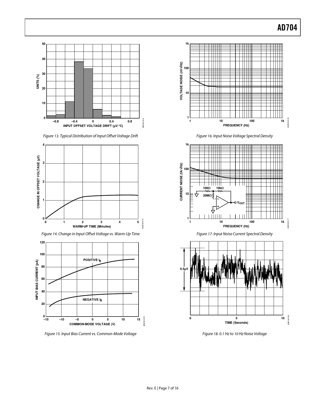 AD704501k40Hz) / 100 nV30(%)E( SOISTNUNI20GE10OLTA V1001–0.8–0.400.40.8 013 1101001k 016 INPUT OFFSET VOLTAGE DRIFT (µV/°C)FREQUENCY (Hz) 00818- 00818- Figure 13. Typical Distribution of Input Offset Voltage Drift Figure 16. Input Noise Voltage Spectral Density 41k) V µ (3GEHz) 100 fA/OLTA( ET VISE2NO100Ω10kΩOFFSNTIN1020MΩGE1NCURREAVOUTH C01012345 014 1101001k 017 WARM-UP TIME (Minutes)FREQUENCY (Hz) 00818- 00818- Figure 14. Change in Input Offset Voltage vs. Warm-Up Time Figure 17. Input Noise Current Spectral Density 120100POSITIVE IA)Bp (80NT0.5µV60CURRE AS BI40UTINPNEGATIVE IB200 018 –15–10–5051015 015 0510COMMON-MODE VOLTAGE (V)TIME (Seconds) 00818- 00818- Figure 15. Input Bias Current vs. Common-Mode Voltage Figure 18. 0.1 Hz to 10 Hz Noise Voltage Rev. E | Page 7 of 16 Document Outline Features Applications General Description Connection Diagrams Revision History Specifications Absolute Maximum Ratings ESD Caution Typical Performance Characteristics Theory of Operation Outline Dimensions Ordering Guide
