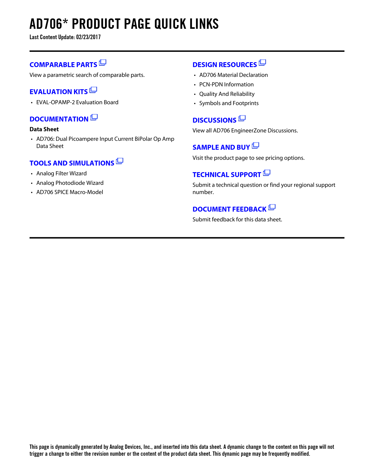 AD706* PRODUCT PAGE QUICK LINKS Last Content Update: 02/23/2017. COMPARABLE PARTS. DESIGN RESOURCES. EVALUATION KITS