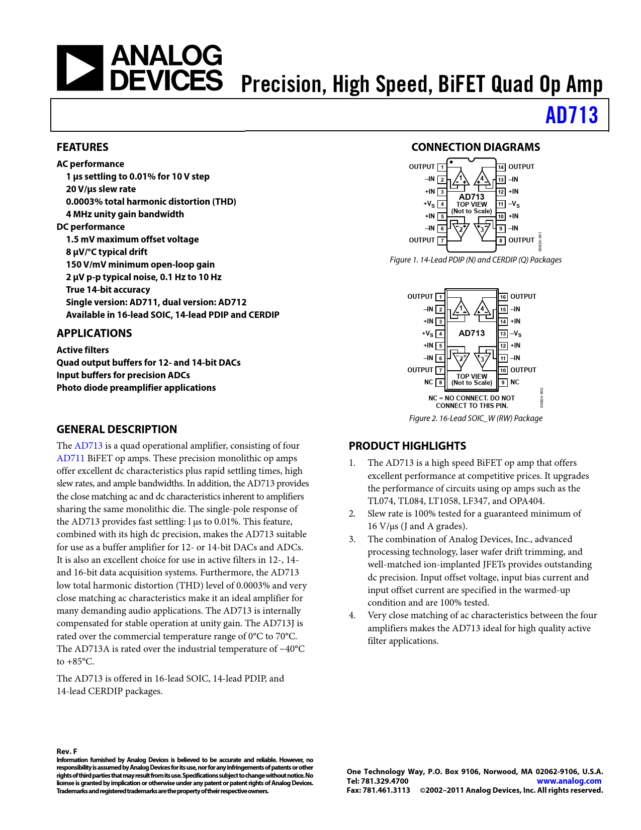Precision, High Speed, BiFET Quad Op Amp. AD713. FEATURES. CONNECTION DIAGRAMS. AC performance. OUTPUT 1. 14 OUTPUT