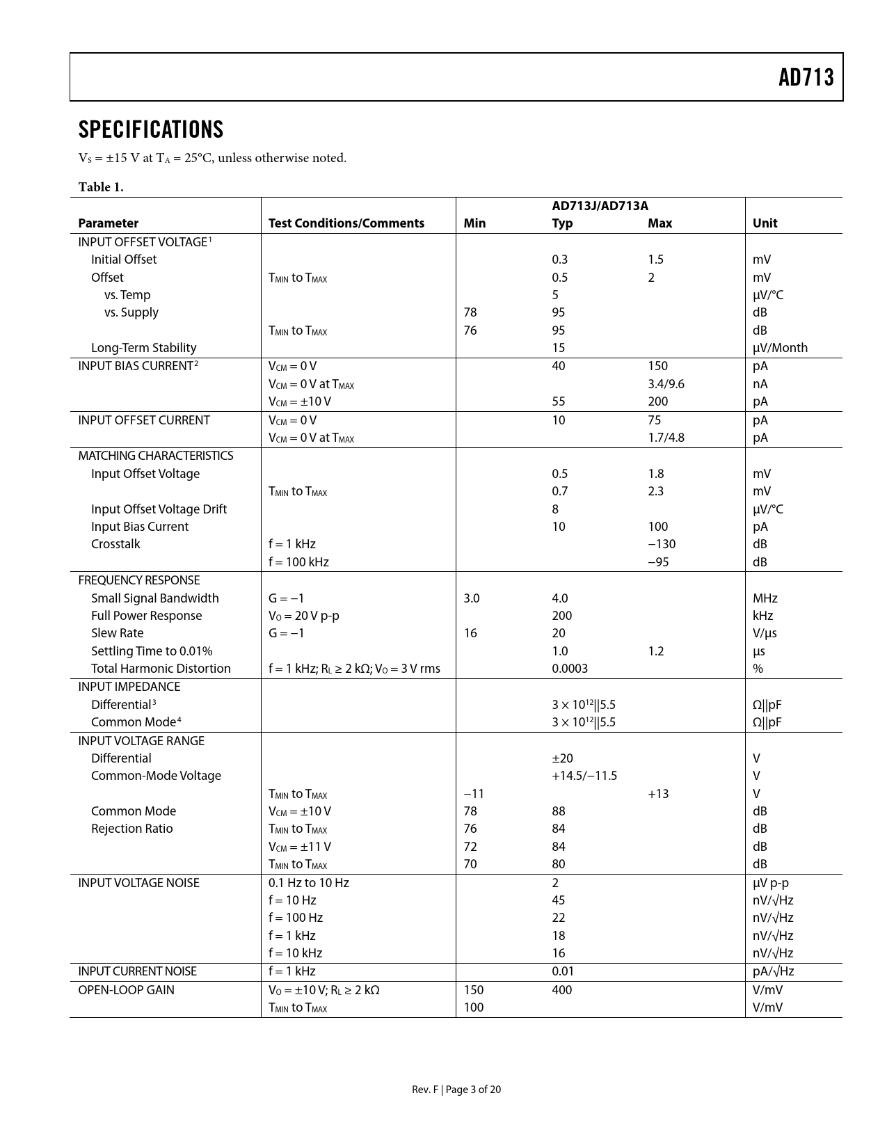 AD713. SPECIFICATIONS. Table 1. AD713J/AD713A. Parameter Test. Conditions/Comments. Min. Typ. Max. Unit