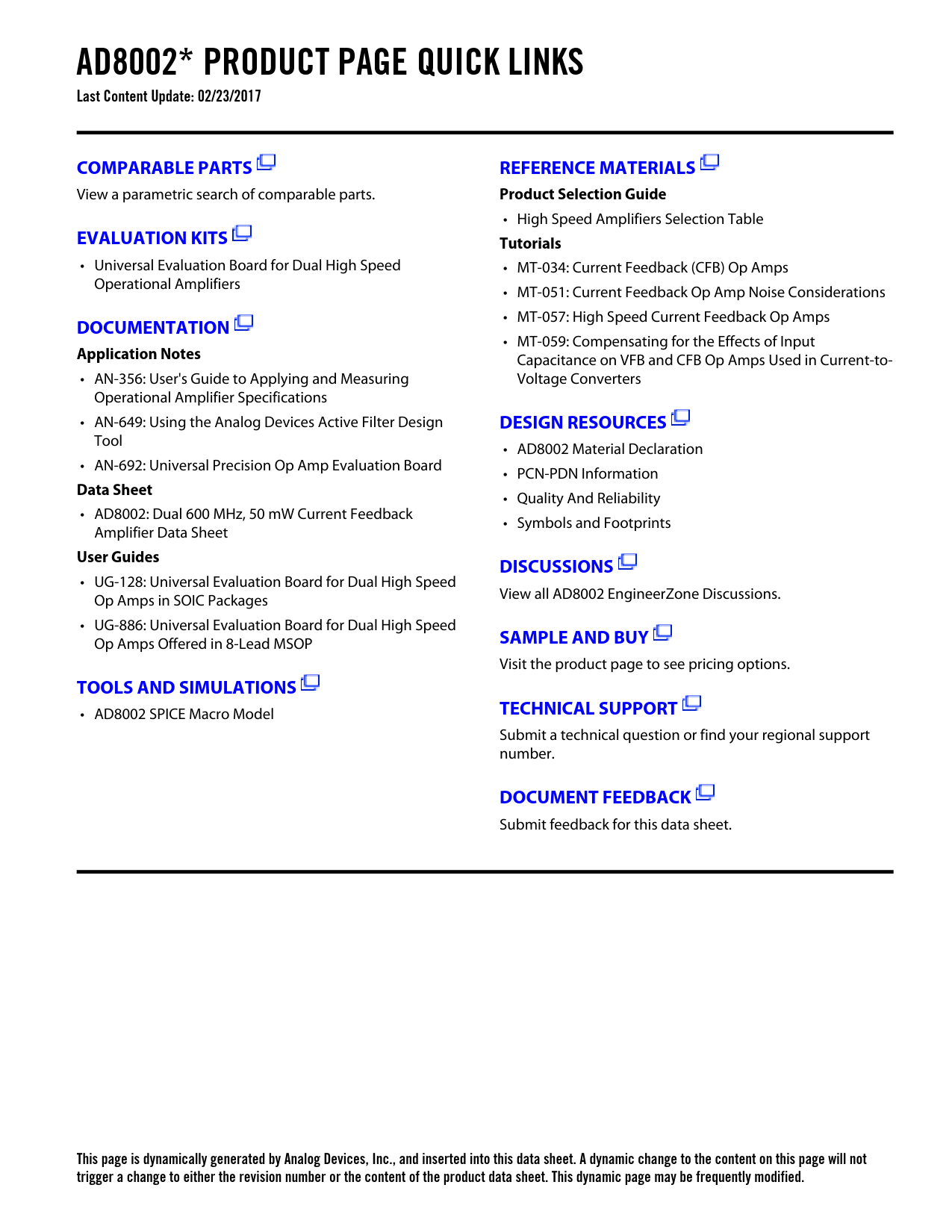 AD8002* PRODUCT PAGE QUICK LINKS Last Content Update: 02/23/2017COMPARABLE PARTSREFERENCE MATERIALS View a parametric search of comparable parts. Product Selection Guide • High Speed Amplifiers Selection Table EVALUATION KITSTutorials • Universal Evaluation Board for Dual High Speed • MT-034: Current Feedback (CFB) Op Amps Operational Amplifiers • MT-051: Current Feedback Op Amp Noise Considerations • MT-057: High Speed Current Feedback Op Amps DOCUMENTATION • MT-059: Compensating for the Effects of Input Application Notes Capacitance on VFB and CFB Op Amps Used in Current-to- • AN-356: User's Guide to Applying and Measuring Voltage Converters Operational Amplifier Specifications • AN-649: Using the Analog Devices Active Filter Design DESIGN RESOURCES Tool • AD8002 Material Declaration • AN-692: Universal Precision Op Amp Evaluation Board • PCN-PDN Information Data Sheet • Quality And Reliability • AD8002: Dual 600 MHz, 50 mW Current Feedback • Symbols and Footprints Amplifier Data Sheet User GuidesDISCUSSIONS • UG-128: Universal Evaluation Board for Dual High Speed Op Amps in SOIC Packages View all AD8002 EngineerZone Discussions. • UG-886: Universal Evaluation Board for Dual High Speed Op Amps Offered in 8-Lead MSOP SAMPLE AND BUY Visit the product page to see pricing options. TOOLS AND SIMULATIONS • AD8002 SPICE Macro Model TECHNICAL SUPPORT Submit a technical question or find your regional support number. DOCUMENT FEEDBACK Submit feedback for this data sheet. This page is dynamically generated by Analog Devices, Inc., and inserted into this data sheet. A dynamic change to the content on this page will not trigger a change to either the revision number or the content of the product data sheet. This dynamic page may be frequently modified. Document Outline Features Applications General Description Pin Connection Block Diagram Table of Contents Revision History Specifications Absolute Maximum Ratings Maximum Power Dissipation ESD Caution Pin Configurations and Function Descriptions Typical Performance Characteristics Test Circuits Theory of Operation Choice of Feedback and Gain Resistors Printed Circuit Board (PCB) Layout Considerations Power Supply Bypassing DC Errors and Noise Driving Capacitive Loads Communications Operation as a Video Line Driver Driving ADCs Single-Ended-to-Differential Driver Using an AD8002 Applications Information Layout Considerations Outline Dimensions Ordering Guide