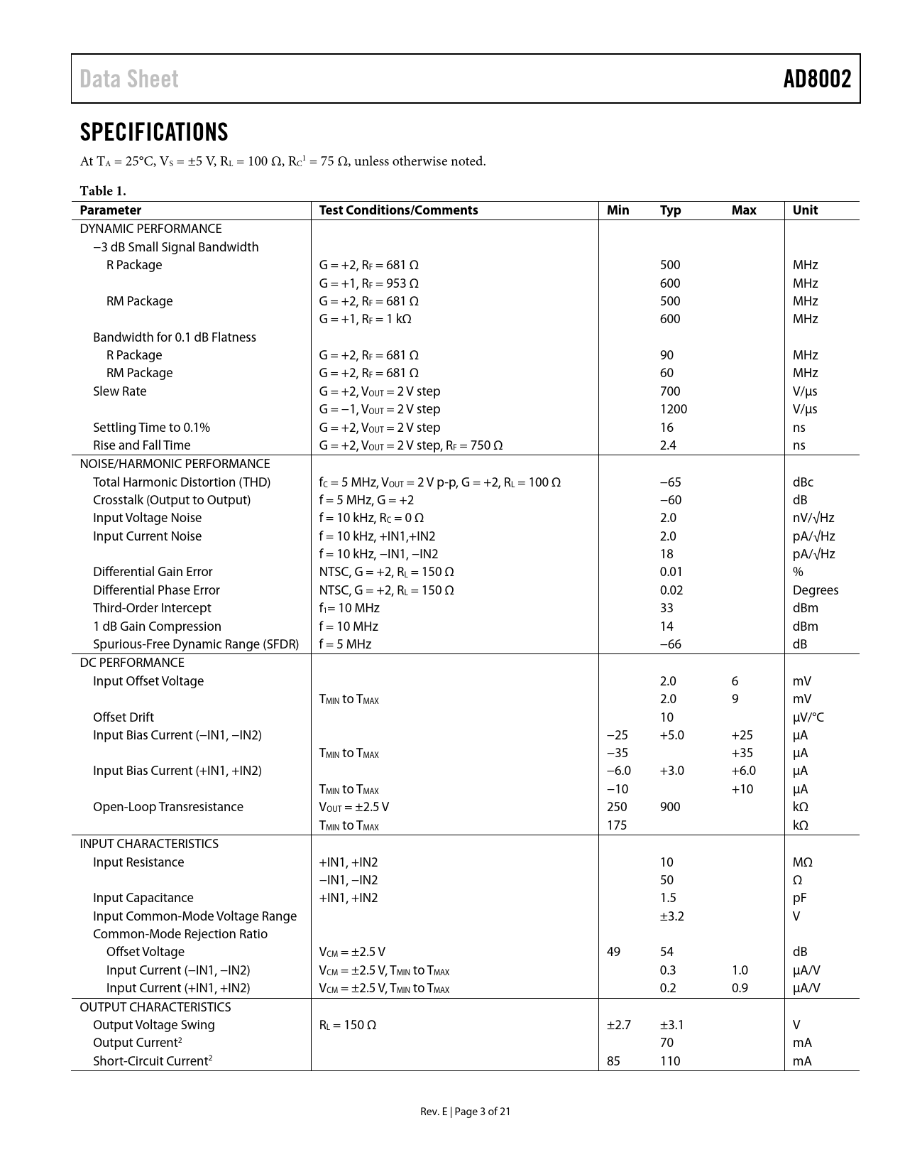link to page 5 link to page 5 link to page 5 Data SheetAD8002SPECIFICATIONS At T 1 A = 25°C, VS = ±5 V, RL = 100 Ω, RC = 75 Ω, unless otherwise noted. Table 1. ParameterTest Conditions/CommentsMinTypMaxUnit DYNAMIC PERFORMANCE −3 dB Small Signal Bandwidth R Package G = +2, RF = 681 Ω 500 MHz G = +1, RF = 953 Ω 600 MHz RM Package G = +2, RF = 681 Ω 500 MHz G = +1, RF = 1 kΩ 600 MHz Bandwidth for 0.1 dB Flatness R Package G = +2, RF = 681 Ω 90 MHz RM Package G = +2, RF = 681 Ω 60 MHz Slew Rate G = +2, VOUT = 2 V step 700 V/µs G = −1, VOUT = 2 V step 1200 V/µs Settling Time to 0.1% G = +2, VOUT = 2 V step 16 ns Rise and Fall Time G = +2, VOUT = 2 V step, RF = 750 Ω 2.4 ns NOISE/HARMONIC PERFORMANCE Total Harmonic Distortion (THD) fC = 5 MHz, VOUT = 2 V p-p, G = +2, RL = 100 Ω −65 dBc Crosstalk (Output to Output) f = 5 MHz, G = +2 −60 dB Input Voltage Noise f = 10 kHz, RC = 0 Ω 2.0 nV/√Hz Input Current Noise f = 10 kHz, +IN1,+IN2 2.0 pA/√Hz f = 10 kHz, −IN1, −IN2 18 pA/√Hz Differential Gain Error NTSC, G = +2, RL = 150 Ω 0.01 % Differential Phase Error NTSC, G = +2, RL = 150 Ω 0.02 Degrees Third-Order Intercept f1= 10 MHz 33 dBm 1 dB Gain Compression f = 10 MHz 14 dBm Spurious-Free Dynamic Range (SFDR) f = 5 MHz −66 dB DC PERFORMANCE Input Offset Voltage 2.0 6 mV TMIN to TMAX 2.0 9 mV Offset Drift 10 µV/°C Input Bias Current (−IN1, −IN2) −25 +5.0 +25 µA TMIN to TMAX −35 +35 µA Input Bias Current (+IN1, +IN2) −6.0 +3.0 +6.0 µA TMIN to TMAX −10 +10 µA Open-Loop Transresistance VOUT = ±2.5 V 250 900 kΩ TMIN to TMAX 175 kΩ INPUT CHARACTERISTICS Input Resistance +IN1, +IN2 10 MΩ −IN1, −IN2 50 Ω Input Capacitance +IN1, +IN2 1.5 pF Input Common-Mode Voltage Range ±3.2 V Common-Mode Rejection Ratio Offset Voltage VCM = ±2.5 V 49 54 dB Input Current (−IN1, −IN2) VCM = ±2.5 V, TMIN to TMAX 0.3 1.0 µA/V Input Current (+IN1, +IN2) VCM = ±2.5 V, TMIN to TMAX 0.2 0.9 µA/V OUTPUT CHARACTERISTICS Output Voltage Swing RL = 150 Ω ±2.7 ±3.1 V Output Current2 70 mA Short-Circuit Current2 85 110 mA Rev. E | Page 3 of 21 Document Outline Features Applications General Description Pin Connection Block Diagram Table of Contents Revision History Specifications Absolute Maximum Ratings Maximum Power Dissipation ESD Caution Pin Configurations and Function Descriptions Typical Performance Characteristics Test Circuits Theory of Operation Choice of Feedback and Gain Resistors Printed Circuit Board (PCB) Layout Considerations Power Supply Bypassing DC Errors and Noise Driving Capacitive Loads Communications Operation as a Video Line Driver Driving ADCs Single-Ended-to-Differential Driver Using an AD8002 Applications Information Layout Considerations Outline Dimensions Ordering Guide
