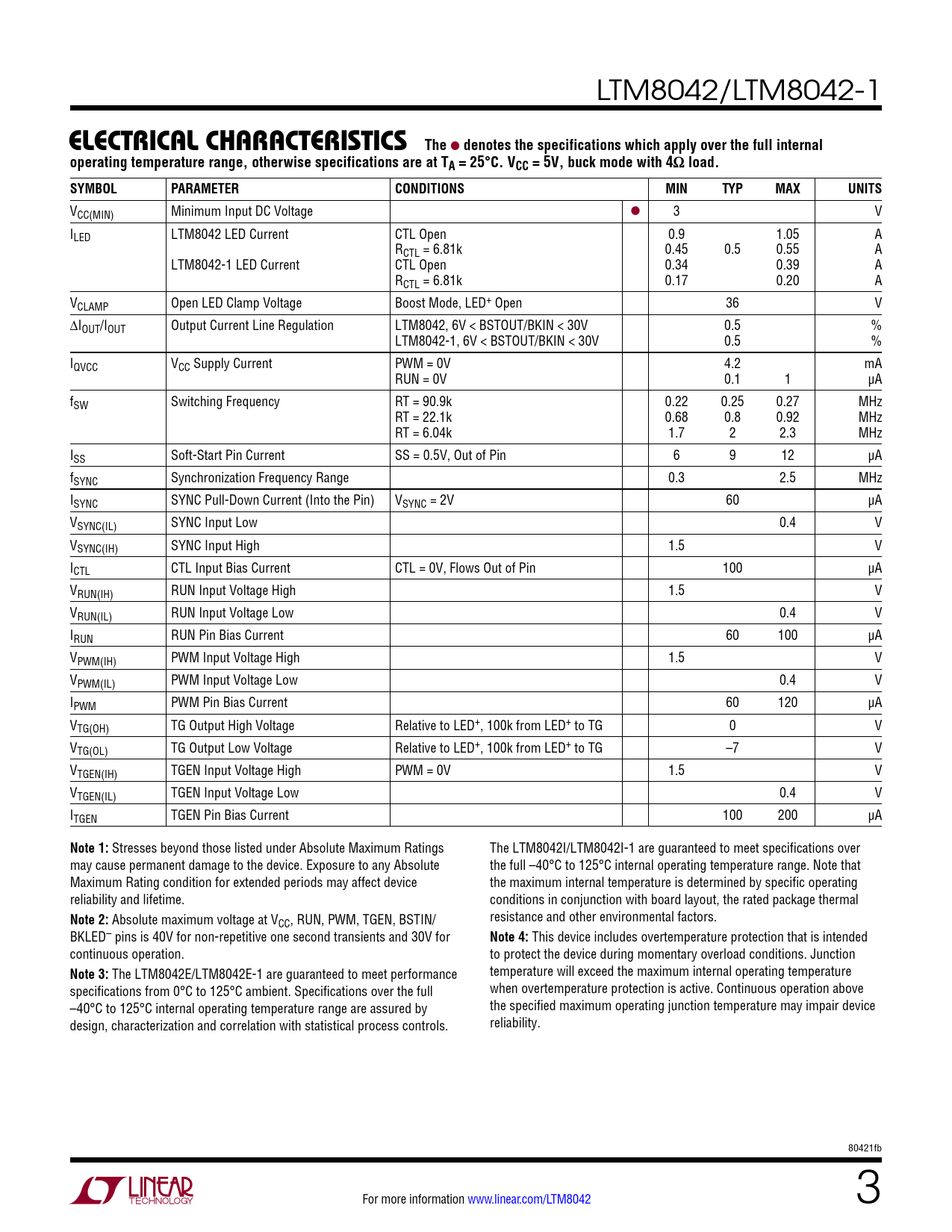 VCC(MIN) Minimum Input DC Voltage l 3 V ILED LTM8042 LED Current CTL Open 0.9 1.05 A RCTL = 6.81k 0.45 0.5 0.55 A LTM8042-1 LED Current CTL Open 0.34 0.39 A RCTL = 6.81k 0.17 0.20 A VCLAMP Open LED Clamp Voltage Boost Mode, LED+ Open 36 V ∆IOUT/IOUT Output Current Line Regulation LTM8042, 6V < BSTOUT/BKIN < 30V 0.5 % LTM8042-1, 6V < BSTOUT/BKIN < 30V 0.5 % IQVCC VCC Supply Current PWM = 0V 4.2 mA RUN = 0V 0.1 1 µA fSW Switching Frequency RT = 90.9k 0.22 0.25 0.27 MHz RT = 22.1k 0.68 0.8 0.92 MHz RT = 6.04k 1.7 2 2.3 MHz ISS Soft-Start Pin Current SS = 0.5V, Out of Pin 6 9 12 µA fSYNC Synchronization Frequency Range 0.3 2.5 MHz ISYNC SYNC Pull-Down Current (Into the Pin) VSYNC = 2V 60 µA VSYNC(IL) SYNC Input Low 0.4 V VSYNC(IH) SYNC Input High 1.5 V ICTL CTL Input Bias Current CTL = 0V, Flows Out of Pin 100 µA VRUN(IH) RUN Input Voltage High 1.5 V VRUN(IL) RUN Input Voltage Low 0.4 V IRUN RUN Pin Bias Current 60 100 µA VPWM(IH) PWM Input Voltage High 1.5 V VPWM(IL) PWM Input Voltage Low 0.4 V IPWM PWM Pin Bias Current 60 120 µA VTG(OH) TG Output High Voltage Relative to LED+, 100k from LED+ to TG 0 V VTG(OL) TG Output Low Voltage Relative to LED+, 100k from LED+ to TG –7 V VTGEN(IH) TGEN Input Voltage High PWM = 0V 1.5 V VTGEN(IL) TGEN Input Voltage Low 0.4 V ITGEN TGEN Pin Bias Current 100 200 µA