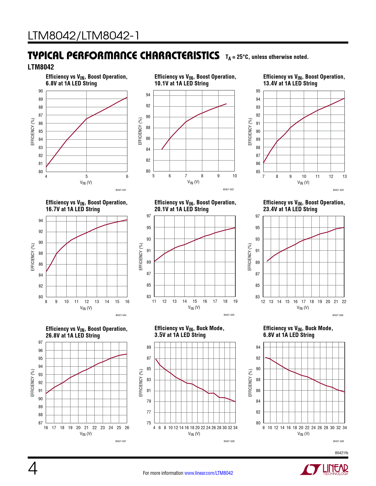 97 89 94 96 95 87 92 94 85 90 93 83 88 92 91 81 86 EFFICIENCY (%) EFFICIENCY (%) EFFICIENCY (%) 90 79 84 89 77 82 88 87 75 80 16 17 18 19 20 21 22 23 24 25 26 4 6 8 10 12 14 16 18 20 22 24 26 28 30 32 34 8 10 12 14 16 18 20 22 24 26 28 30 32 34 VIN (V) VIN (V) VIN (V) 80421 G07 80421 G08 80421 G09 80421fb 4 For more information www.linear.com/LTM8042