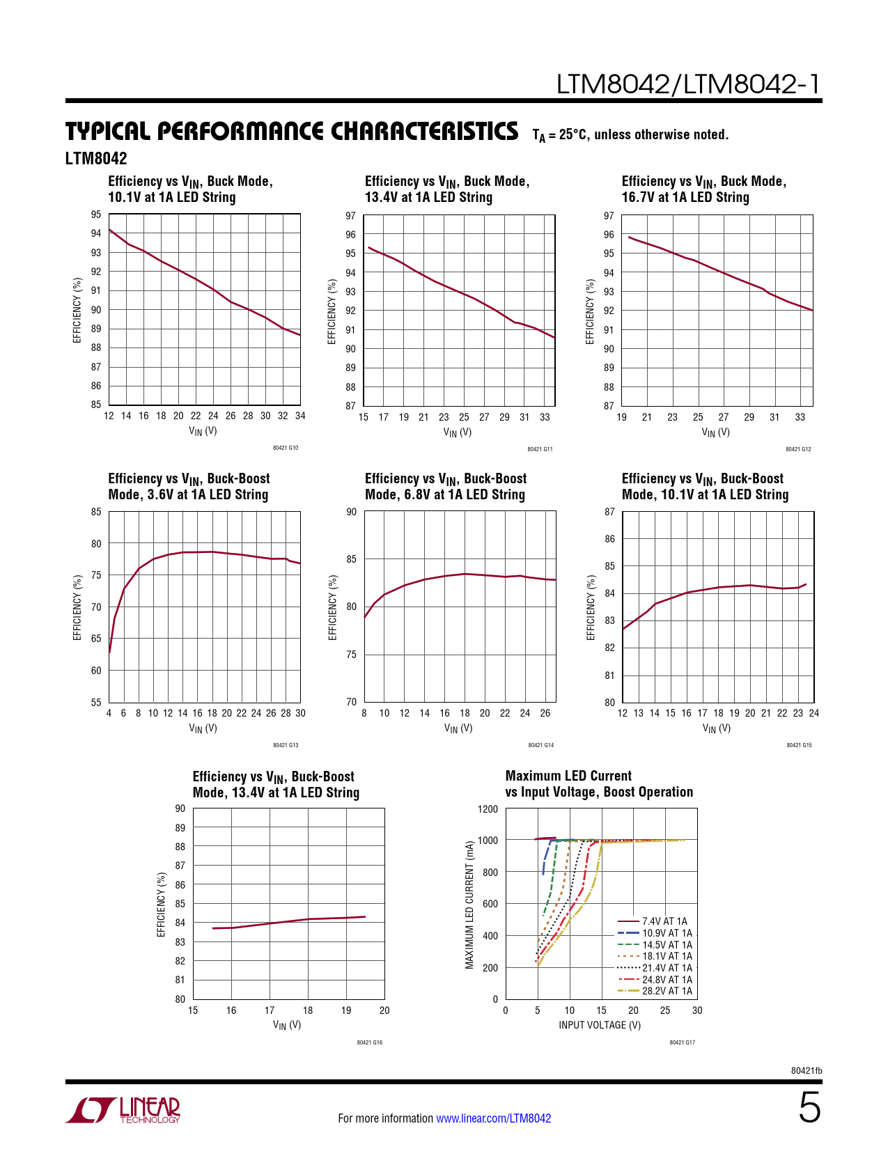 90 1200 89 88 1000 87 800 86 85 600 84 7.4V AT 1A EFFICIENCY (%) 10.9V AT 1A 83 400 14.5V AT 1A 82 18.1V AT 1A MAXIMUM LED CURRENT (mA) 200 21.4V AT 1A 81 24.8V AT 1A 28.2V AT 1A 80 0 15 16 17 18 19 20 0 5 10 15 20 25 30 VIN (V) INPUT VOLTAGE (V) 80421 G16 80421 G17 80421fb For more information www.linear.com/LTM8042 5