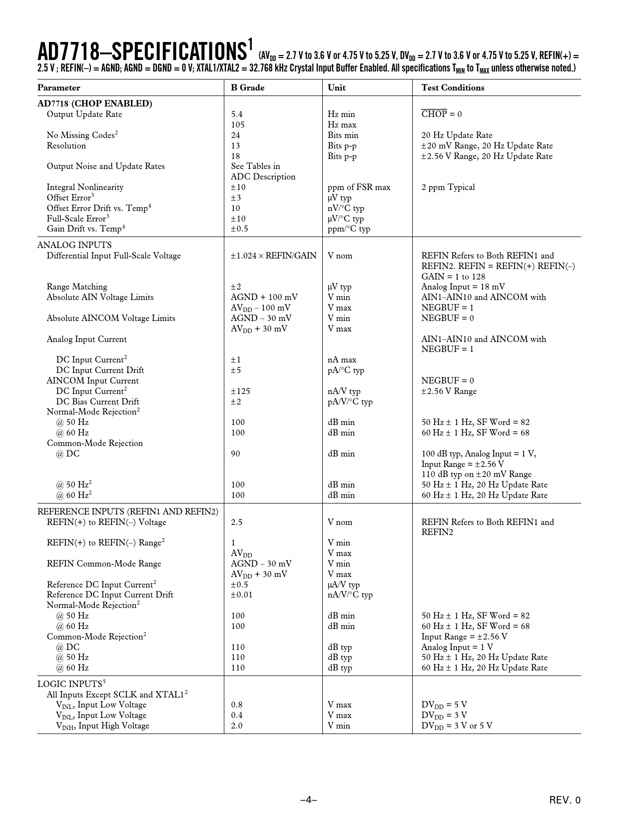 AD7718–SPECIFICATIONS1 (AVDD = 2.7 V to 3.6 V or 4.75 V to 5.25 V, DVDD = 2.7 V to 3.6 V or 4.75 V to 5.25 V, REFIN(+) = 2.5 V ; REFIN(–) = AGND; AGND = DGND = 0 V; XTAL1/XTAL2 = 32.768 kHz Crystal Input Buffer Enabled. All specifications TMIN to TMAX unless otherwise noted.) Parameter B Grade Unit Test Conditions AD7718 (CHOP ENABLED)
