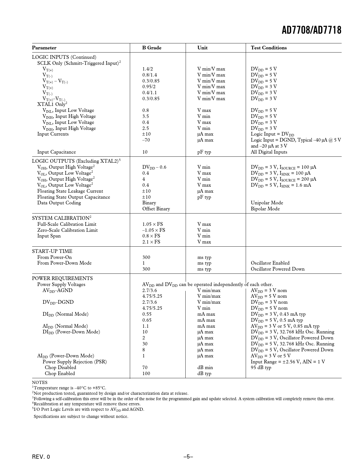 AD7708/AD7718ParameterB GradeUnitTest Conditions LOGIC INPUTS (Continued) SCLK Only (Schmitt-Triggered Input)2 VT(+) 1.4/2 V min/V max DVDD = 5 V VT(–) 0.8/1.4 V min/V max DVDD = 5 V VT(+) – VT(–) 0.3/0.85 V min/V max DVDD = 5 V VT(+) 0.95/2 V min/V max DVDD = 3 V VT(–) 0.4/1.1 V min/V max DVDD = 3 V VT(+)–VT(–) 0.3/0.85 V min/V max DVDD = 3 V XTAL1 Only2 VINL, Input Low Voltage 0.8 V max DVDD = 5 V VINH, Input High Voltage 3.5 V min DVDD = 5 V VINL, Input Low Voltage 0.4 V max DVDD = 3 V VINH, Input High Voltage 2.5 V min DVDD = 3 V Input Currents ±10 µA max Logic Input = DVDD –70 µA max Logic Input = DGND, Typical –40 µA @ 5 V and –20 µA at 3 V Input Capacitance 10 pF typ All Digital Inputs LOGIC OUTPUTS (Excluding XTAL2)5 V OH, Output High Voltage2 DVDD – 0.6 V min DVDD = 3 V, ISOURCE = 100 µA VOL, Output Low Voltage2 0.4 V max DVDD = 3 V, ISINK = 100 µA VOH, Output High Voltage2 4 V min DVDD = 5 V, ISOURCE = 200 µA VOL, Output Low Voltage2 0.4 V max DVDD = 5 V, ISINK = 1.6 mA Floating State Leakage Current ±10 µA max Floating State Output Capacitance ±10 pF typ Data Output Coding Binary Unipolar Mode Offset Binary Bipolar Mode SYSTEM CALIBRATION2 Full-Scale Calibration Limit 1.05 × FS V max Zero-Scale Calibration Limit –1.05 × FS V min Input Span 0.8 × FS V min 2.1 × FS V max START-UP TIME From Power-On 300 ms typ From Power-Down Mode 1 ms typ Oscillator Enabled 300 ms typ Oscillator Powered Down POWER REQUIREMENTS Power Supply Voltages AVDD and DVDD can be operated independently of each other. AVDD–AGND 2.7/3.6 V min/max AVDD = 3 V nom 4.75/5.25 V min/max AVDD = 5 V nom DVDD–DGND 2.7/3.6 V min/max DVDD = 3 V nom 4.75/5.25 V min DVDD = 5 V nom DIDD (Normal Mode) 0.55 mA max DVDD = 3 V, 0.43 mA typ 0.65 mA max DVDD = 5 V, 0.5 mA typ AIDD (Normal Mode) 1.1 mA max AVDD = 3 V or 5 V, 0.85 mA typ DIDD (Power-Down Mode) 10 µA max DVDD = 3 V, 32.768 kHz Osc. Running 2 µA max DVDD = 3 V, Oscillator Powered Down 30 µA max DVDD = 5 V, 32.768 kHz Osc. Running 8 µA max DVDD = 5 V, Oscillator Powered Down AIDD (Power-Down Mode) 1 µA max AVDD = 3 V or 5 V Power Supply Rejection (PSR) Input Range = ± 2.56 V, AIN = 1 V Chop Disabled 70 dB min 95 dB typ Chop Enabled 100 dB typ NOTES 1Temperature range is –40°C to +85°C. 2Not production tested, guaranteed by design and/or characterization data at release. 3Following a self-calibration this error will be in the order of the noise for the programmed gain and update selected. A system calibration will completely remove this error. 4Recalibration at any temperature will remove these errors. 5I/O Port Logic Levels are with respect to AVDD and AGND. Specifications are subject to change without notice. REV. 0 –5–