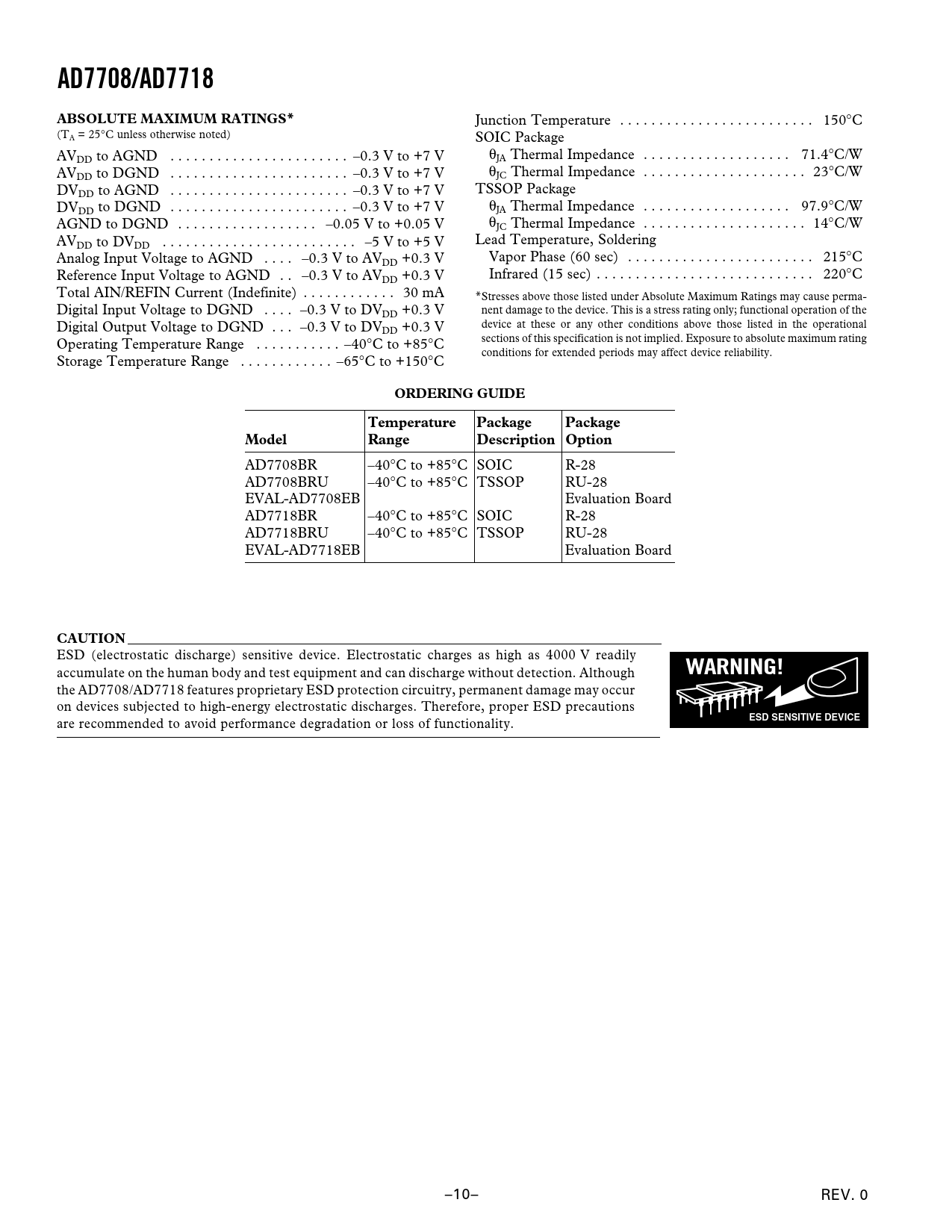 AD7708/AD7718ABSOLUTE MAXIMUM RATINGS* Junction Temperature . 150°C (TA = 25°C unless otherwise noted) SOIC Package AV θ DD to AGND . –0.3 V to +7 V JA Thermal Impedance . 71.4°C/W AV θ DD to DGND . –0.3 V to +7 V JC Thermal Impedance . 23°C/W DV TSSOP Package DD to AGND . –0.3 V to +7 V DV θ DD to DGND . –0.3 V to +7 V JA Thermal Impedance . 97.9°C/W AGND to DGND . –0.05 V to +0.05 V θJC Thermal Impedance . 14°C/W AV Lead Temperature, Soldering DD to DVDD . –5 V to +5 V Analog Input Voltage to AGND . –0.3 V to AV Vapor Phase (60 sec) . 215°C DD +0.3 V Reference Input Voltage to AGND . –0.3 V to AV Infrared (15 sec) . 220°C DD +0.3 V Total AIN/REFIN Current (Indefinite) . 30 mA *Stresses above those listed under Absolute Maximum Ratings may cause perma- Digital Input Voltage to DGND . –0.3 V to DVDD +0.3 V nent damage to the device. This is a stress rating only; functional operation of the Digital Output Voltage to DGND . –0.3 V to DV device at these or any other conditions above those listed in the operational DD +0.3 V Operating Temperature Range . –40°C to +85°C sections of this specification is not implied. Exposure to absolute maximum rating conditions for extended periods may affect device reliability. Storage Temperature Range . –65°C to +150°C ORDERING GUIDETemperaturePackagePackageModelRangeDescription Option AD7708BR –40°C to +85°C SOIC R-28 AD7708BRU –40°C to +85°C TSSOP RU-28 EVAL-AD7708EB Evaluation Board AD7718BR –40°C to +85°C SOIC R-28 AD7718BRU –40°C to +85°C TSSOP RU-28 EVAL-AD7718EB Evaluation Board CAUTION ESD (electrostatic discharge) sensitive device. Electrostatic charges as high as 4000 V readily accumulate on the human body and test equipment and can discharge without detection. Although WARNING! the AD7708/AD7718 features proprietary ESD protection circuitry, permanent damage may occur on devices subjected to high-energy electrostatic discharges. Therefore, proper ESD precautions ESD SENSITIVE DEVICE are recommended to avoid performance degradation or loss of functionality. –10– REV. 0