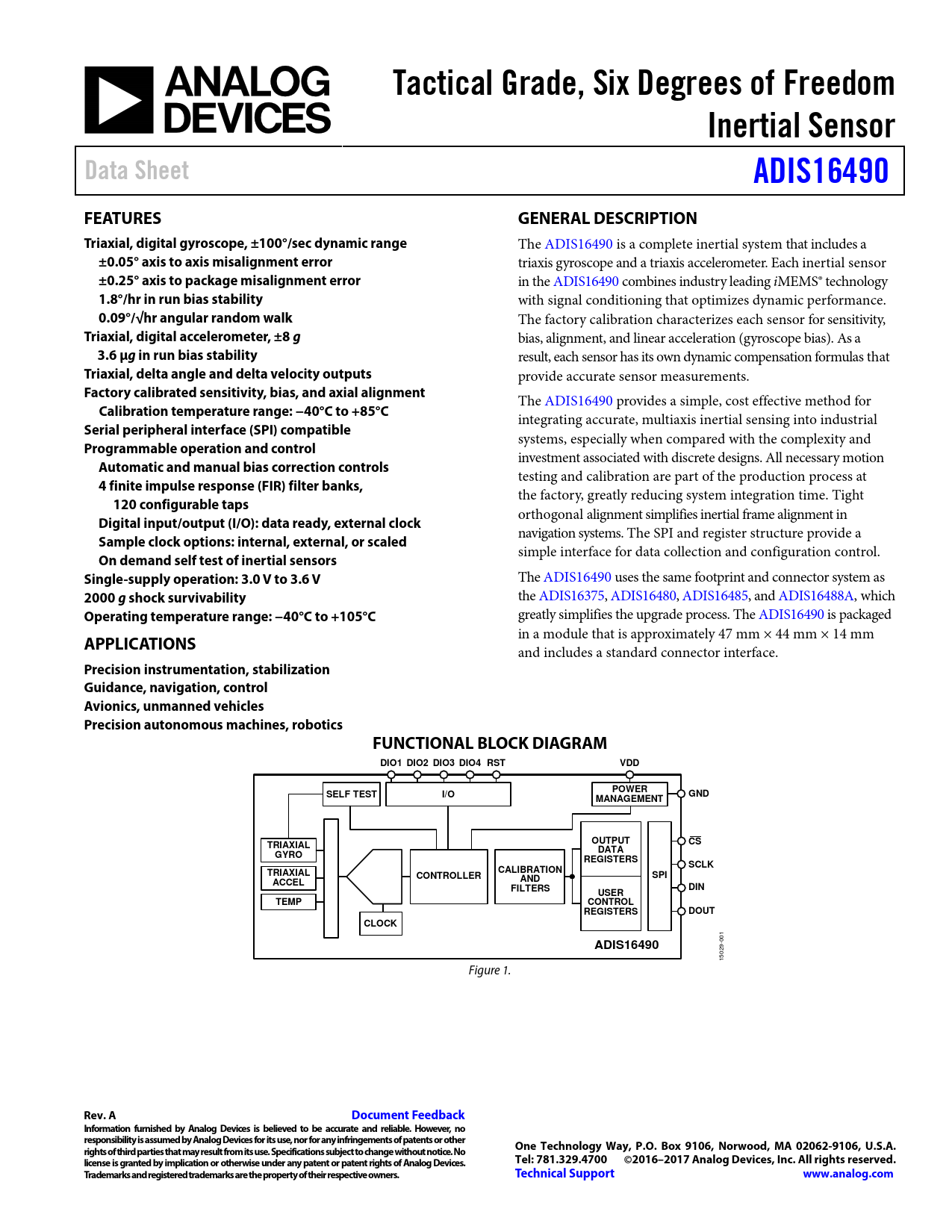 Tactical Grade, Six Degrees of Freedom Inertial Sensor Data Sheet ADIS16490 FEATURES GENERAL DESCRIPTION Triaxial, digital gyroscope, ±100°/sec dynamic range