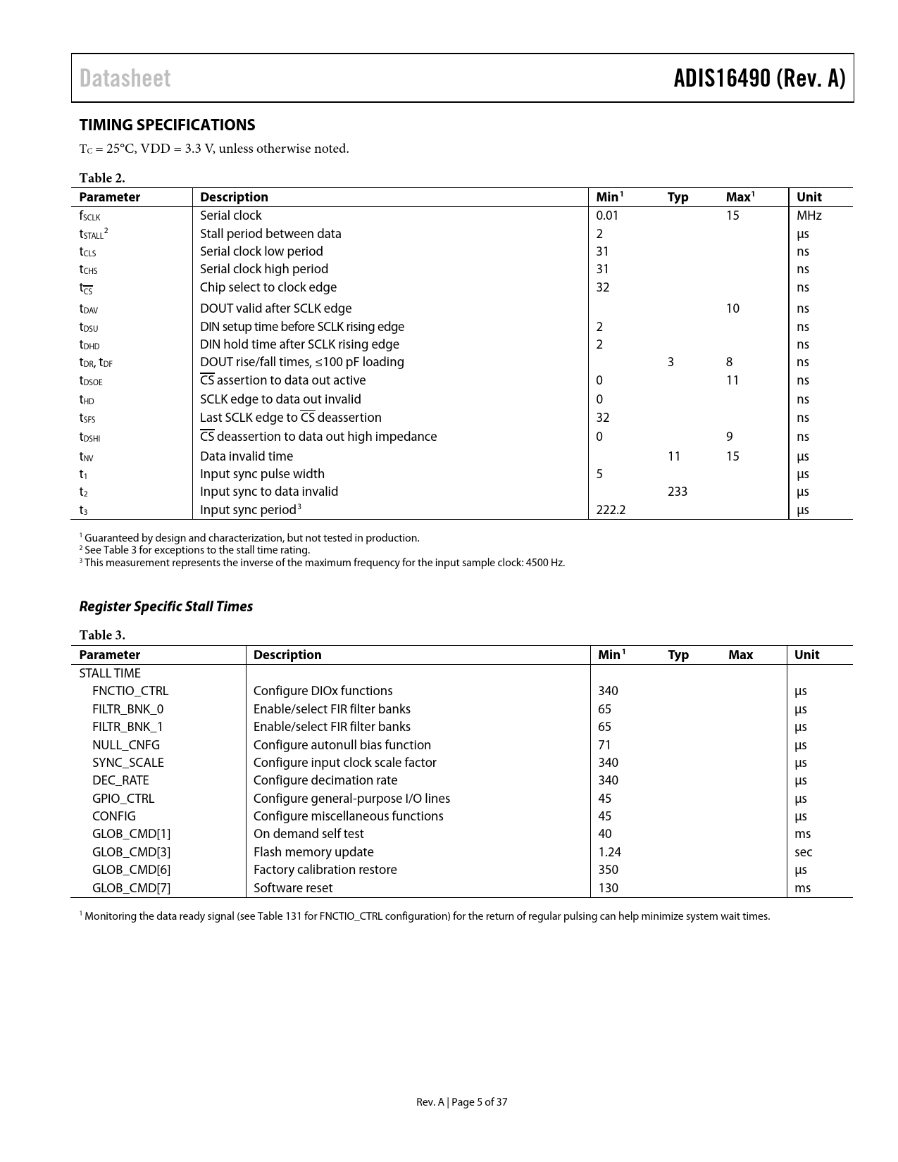 Datasheet. ADIS16490 (Rev. A). TIMING SPECIFICATIONS. Table 2. Parameter. Description. Min1. Typ. Max1. Unit