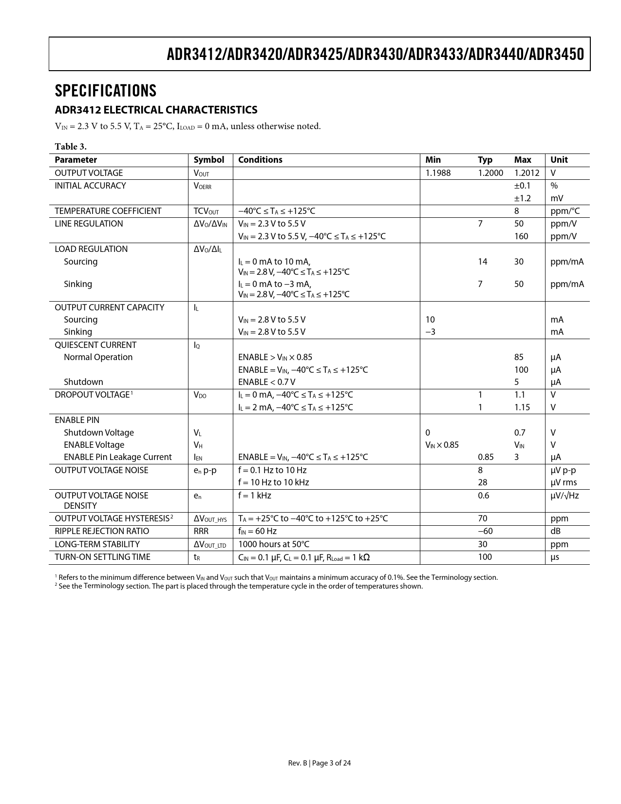 link to page 2 link to page 2 link to page 3 link to page 3 ADR3412/ADR3420/ADR3425/ADR3430/ADR3433/ADR3440/ADR3450SPECIFICATIONS ADR3412 ELECTRICAL CHARACTERISTICS VIN = 2.3 V to 5.5 V, TA = 25°C, ILOAD = 0 mA, unless otherwise noted. Table 3. Parameter SymbolConditionsMinTypMaxUnit OUTPUT VOLTAGE VOUT 1.1988 1.2000 1.2012 V INITIAL ACCURACY VOERR ±0.1 % ±1.2 mV TEMPERATURE COEFFICIENT TCVOUT −40°C ≤ TA ≤ +125°C 8 ppm/°C LINE REGULATION ΔVO/ΔVIN VIN = 2.3 V to 5.5 V 7 50 ppm/V VIN = 2.3 V to 5.5 V, −40°C ≤ TA ≤ +125°C 160 ppm/V LOAD REGULATION ΔVO/ΔIL Sourcing IL = 0 mA to 10 mA, 14 30 ppm/mA VIN = 2.8 V, −40°C ≤ TA ≤ +125°C Sinking IL = 0 mA to −3 mA, 7 50 ppm/mA VIN = 2.8 V, −40°C ≤ TA ≤ +125°C OUTPUT CURRENT CAPACITY IL Sourcing VIN = 2.8 V to 5.5 V 10 mA Sinking VIN = 2.8 V to 5.5 V −3 mA QUIESCENT CURRENT IQ Normal Operation ENABLE > VIN × 0.85 85 μA ENABLE = VIN, −40°C ≤ TA ≤ +125°C 100 μA Shutdown ENABLE < 0.7 V 5 μA DROPOUT VOLTAGE1 V DO IL = 0 mA, −40°C ≤ TA ≤ +125°C 1 1.1 V IL = 2 mA, −40°C ≤ TA ≤ +125°C 1 1.15 V ENABLE PIN Shutdown Voltage VL 0 0.7 V ENABLE Voltage VH VIN × 0.85 VIN V ENABLE Pin Leakage Current IEN ENABLE = VIN, −40°C ≤ TA ≤ +125°C 0.85 3 μA OUTPUT VOLTAGE NOISE en p-p f = 0.1 Hz to 10 Hz 8 μV p-p f = 10 Hz to 10 kHz 28 μV rms OUTPUT VOLTAGE NOISE en f = 1 kHz 0.6 μV/√Hz DENSITY OUTPUT VOLTAGE HYSTERESIS2 ΔV OUT_HYS TA = +25°C to −40°C to +125°C to +25°C 70 ppm RIPPLE REJECTION RATIO RRR fIN = 60 Hz −60 dB LONG-TERM STABILITY ΔVOUT_LTD 1000 hours at 50°C 30 ppm TURN-ON SETTLING TIME tR CIN = 0.1 μF, CL = 0.1 μF, RLoad = 1 kΩ 100 μs 1 Refers to the minimum difference between VIN and VOUT such that VOUT maintains a minimum accuracy of 0.1%. See the Termin s ology ection. 2 See the Terminology section. The part is placed through the temperature cycle in the order of temperatures shown. Rev. B | Page 3 of 24 Document Outline FEATURES APPLICATIONS PIN CONFIGURATION GENERAL DESCRIPTION TABLE OF CONTENTS REVISION HISTORY SPECIFICATIONS ADR3412 ELECTRICAL CHARACTERISTICS ADR3420 ELECTRICAL CHARACTERISTICS ADR3425 ELECTRICAL CHARACTERISTICS ADR3430 ELECTRICAL CHARACTERISTICS ADR3433 ELECTRICAL CHARACTERISTICS ADR3440 ELECTRICAL CHARACTERISTICS ADR3450 ELECTRICAL CHARACTERISTICS ABSOLUTE MAXIMUM RATINGS AND MINIMUM OPERATING CONDITION THERMAL RESISTANCE ESD CAUTION PIN CONFIGURATION AND FUNCTION DESCRIPTIONS TYPICAL PERFORMANCE CHARACTERISTICS TERMINOLOGY THEORY OF OPERATION LONG-TERM STABILITY POWER DISSIPATION APPLICATIONS INFORMATION BASIC VOLTAGE REFERENCE CONNECTION INPUT AND OUTPUT CAPACITORS 4-WIRE KELVIN CONNECTIONS VIN SLEW RATE CONSIDERATIONS SHUTDOWN/ENABLE FEATURE SAMPLE APPLICATIONS Negative Reference Bipolar Output Reference Boosted Output Current Reference OUTLINE DIMENSIONS ORDERING GUIDE