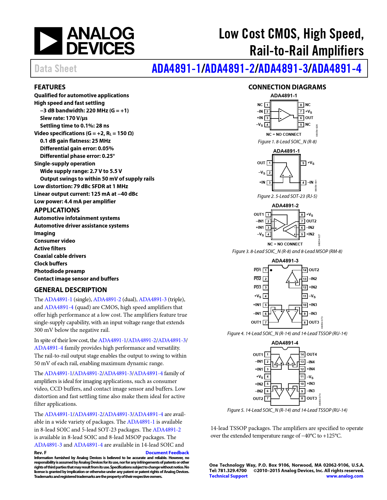 Low Cost CMOS, High Speed,. Rail-to-Rail Amplifiers. Data Sheet. ADA4891-1/. ADA4891-2/. ADA4891-3/. ADA4891-4. FEATURES