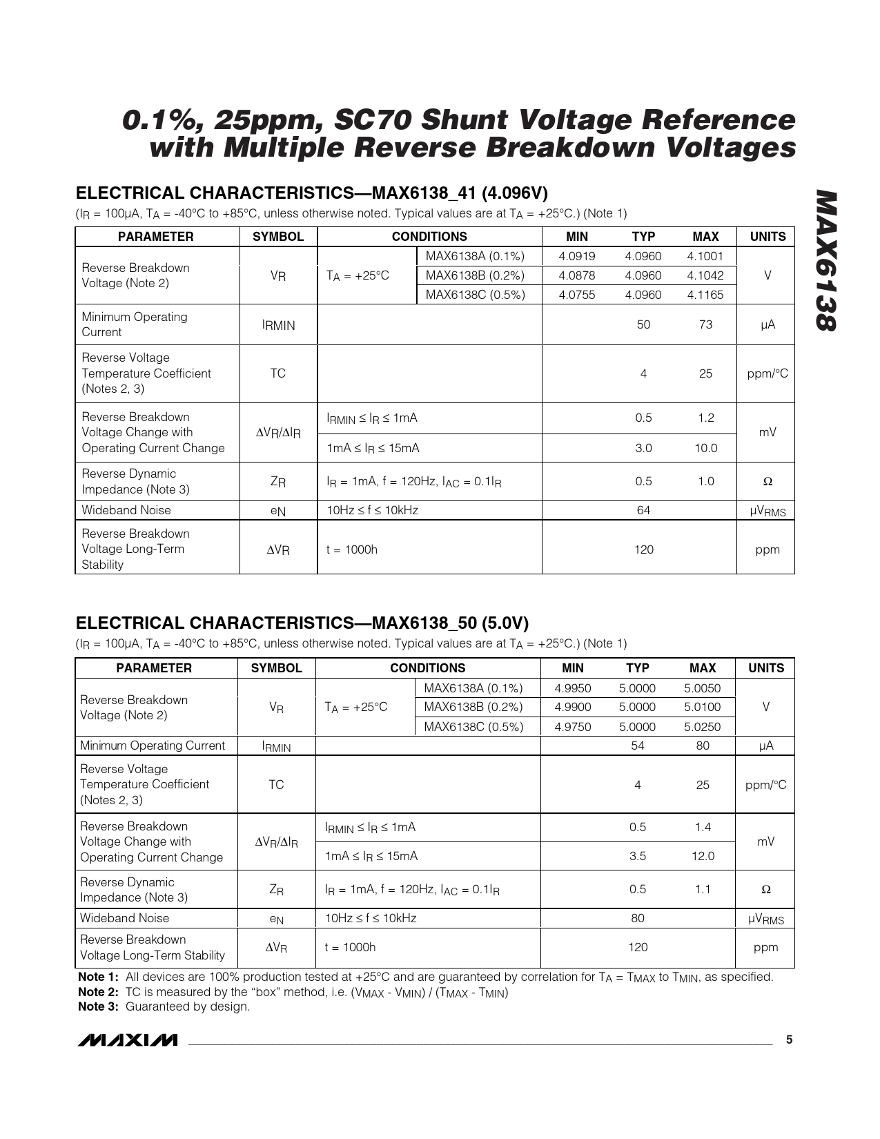 MAX6138A (0.1%) 4.9950 5.0000 5.0050 Reverse Breakdown VR TA = +25°C MAX6138B (0.2%) 4.9900 5.0000 5.0100 V Voltage (Note 2) MAX6138C (0.5%) 4.9750 5.0000 5.0250 M i ni m um Op er ati ng C ur r ent IRMIN 54 80 µA Reverse Voltage Temperature Coefficient TC 4 25 ppm/°C (Notes 2, 3) Reverse Breakdown IRMIN ≤ IR ≤ 1mA 0.5 1.4 Voltage Change with ∆VR/∆IR mV Operating Current Change 1mA ≤ IR ≤ 15mA 3.5 12.0 Reverse Dynamic ZR IR = 1mA, f = 120Hz, IAC = 0.1IR 0.5 1.1 Ω Impedance (Note 3) Wideband Noise eN 10Hz ≤ f ≤ 10kHz 80 µVRMS Rever se Br eakd ow n ∆VR t = 1000h 120 ppm V ol tag e Long - Ter m S tab i l i ty