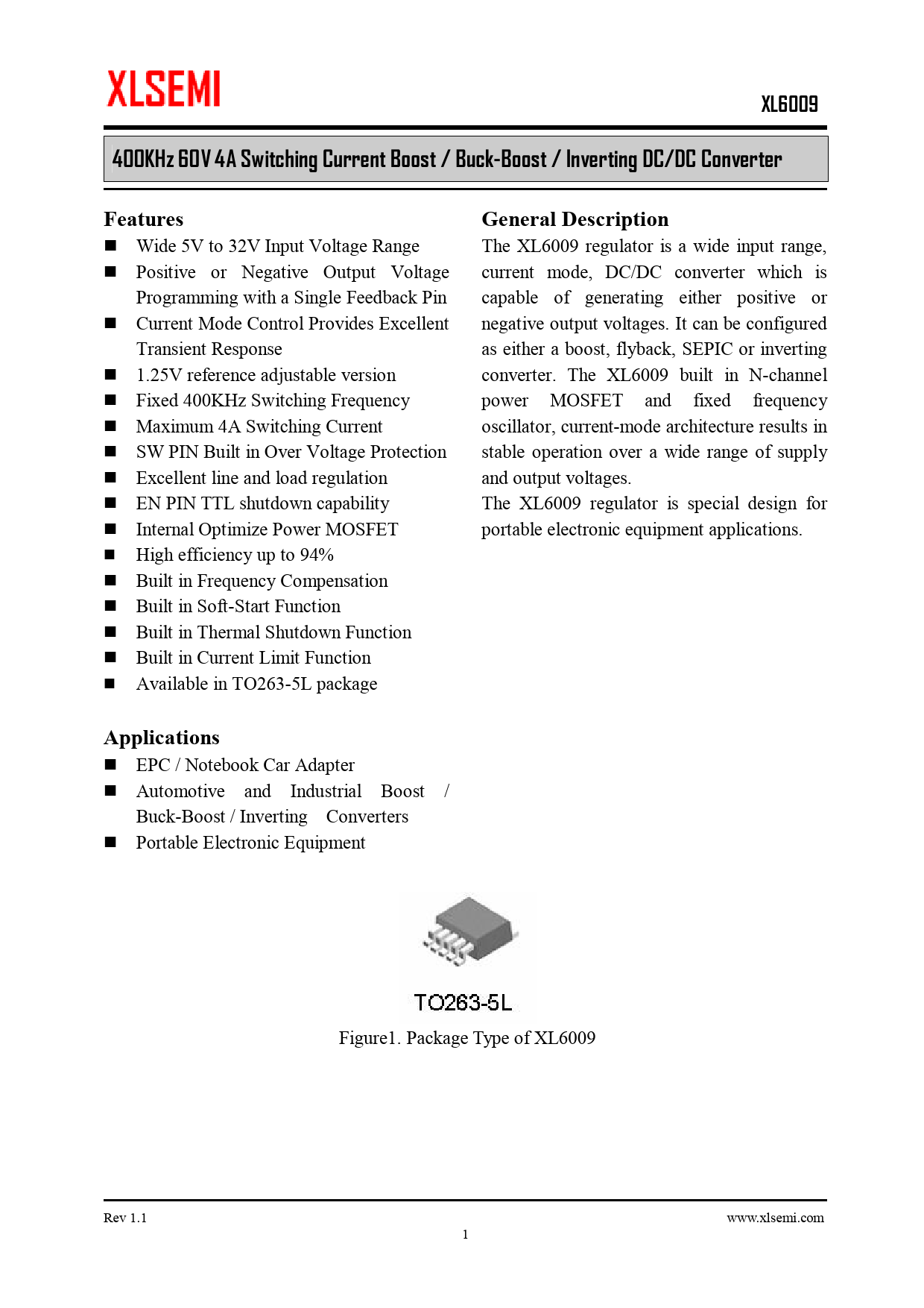 XL6009. 400KHz 60V 4A Switching Current Boost / Buck-Boost / Inverting DC/DC Converter. Features. General Description