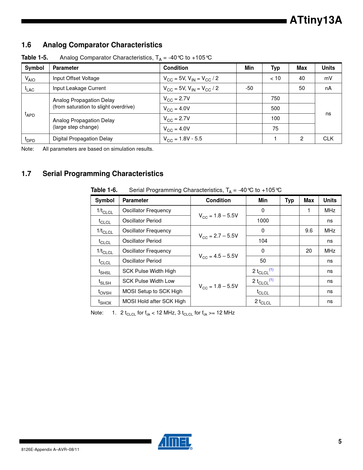 link to page 5 link to page 5 ATtiny13A1.6Analog Comparator CharacteristicsTable 1-5. Analog Comparator Characteristics, T = -40°C to +105°C A SymbolParameterConditionMinTypMaxUnits VAIO Input Offset Voltage VCC = 5V, VIN = VCC / 2 < 10 40 mV ILAC Input Leakage Current VCC = 5V, VIN = VCC / 2 -50 50 nA Analog Propagation Delay VCC = 2.7V 750 (from saturation to slight overdrive) VCC = 4.0V 500 tAPD ns Analog Propagation Delay VCC = 2.7V 100 (large step change) VCC = 4.0V 75 tDPD Digital Propagation Delay VCC = 1.8V - 5.5 1 2 CLK Note: All parameters are based on simulation results. 1.7Serial Programming CharacteristicsTable 1-6. Serial Programming Characteristics, T = -40°C to +105°C A SymbolParameterConditionMinTypMaxUnits 1/tCLCL Oscillator Frequency 0 1 MHz V = 1.8 – 5.5V CC tCLCL Oscillator Period 1000 ns 1/tCLCL Oscillator Frequency 0 9.6 MHz V = 2.7 – 5.5V CC tCLCL Oscillator Period 104 ns 1/tCLCL Oscillator Frequency 0 20 MHz VCC = 4.5 – 5.5V tCLCL Oscillator Period 50 ns t (1) SHSL SCK Pulse Width High 2 tCLCL ns t (1) SLSH SCK Pulse Width Low 2 tCLCL ns VCC = 1.8 – 5.5V tOVSH MOSI Setup to SCK High tCLCL ns tSHOX MOSI Hold after SCK High 2 tCLCL ns Note: 1. 2 t for f < 12 MHz, 3 t for f >= 12 MHz CLCL ck CLCL ck 5 8126E-Appendix A–AVR–08/11 Document Outline Appendix A – ATtiny13A Specification at 105°C 1. Electrical Characteristics 1.1 Absolute Maximum Ratings* 1.2 DC Characteristics 1.3 Clock Characteristics 1.3.1 Accuracy of Calibrated Internal Oscillator 1.4 System and Reset Characteristics 1.4.1 Enhanced Power-On Reset 1.5 ADC Characteristics 1.6 Analog Comparator Characteristics 1.7 Serial Programming Characteristics 2. Typical Characteristics 2.1 Current Consumption in Active Mode 2.2 Current Consumption in Idle Mode 2.3 Current Consumption in Power-Down Mode 2.4 Current Consumption of Peripheral Units 2.5 Pull-up Resistors 2.6 Output Driver Strength (Low Power Pins) 2.7 Output Driver Strength (Regular Pins) 2.8 Input Thresholds and Hysteresis (for I/O Ports) 2.9 BOD, Bandgap and Reset 2.10 Internal Oscillator Speed 3. Ordering Information 4. Revision History
