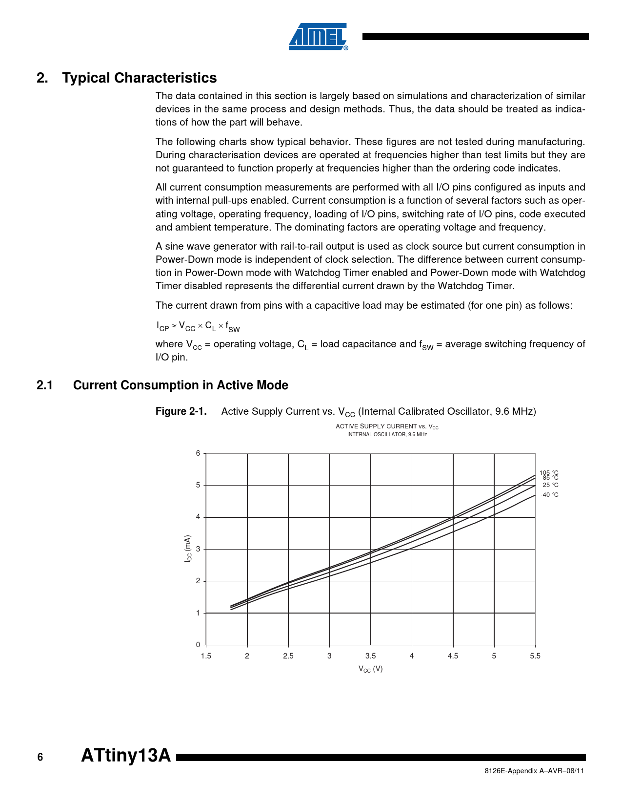The data contained in this section is largely based on simulations and characterization of similar devices in the same process and design methods. Thus, the data should be treated as indica- tions of how the part will behave. The following charts show typical behavior. These figures are not tested during manufacturing. During characterisation devices are operated at frequencies higher than test limits but they are not guaranteed to function properly at frequencies higher than the ordering code indicates. All current consumption measurements are performed with all I/O pins configured as inputs and with internal pull-ups enabled. Current consumption is a function of several factors such as oper- ating voltage, operating frequency, loading of I/O pins, switching rate of I/O pins, code executed and ambient temperature. The dominating factors are operating voltage and frequency. A sine wave generator with rail-to-rail output is used as clock source but current consumption in Power-Down mode is independent of clock selection. The difference between current consump- tion in Power-Down mode with Watchdog Timer enabled and Power-Down mode with Watchdog Timer disabled represents the differential current drawn by the Watchdog Timer. The current drawn from pins with a capacitive load may be estimated (for one pin) as follows: I ≈ V × C × f CP CC L SW where V = operating voltage, C = load capacitance and f = average switching frequency of CC L SW I/O pin.