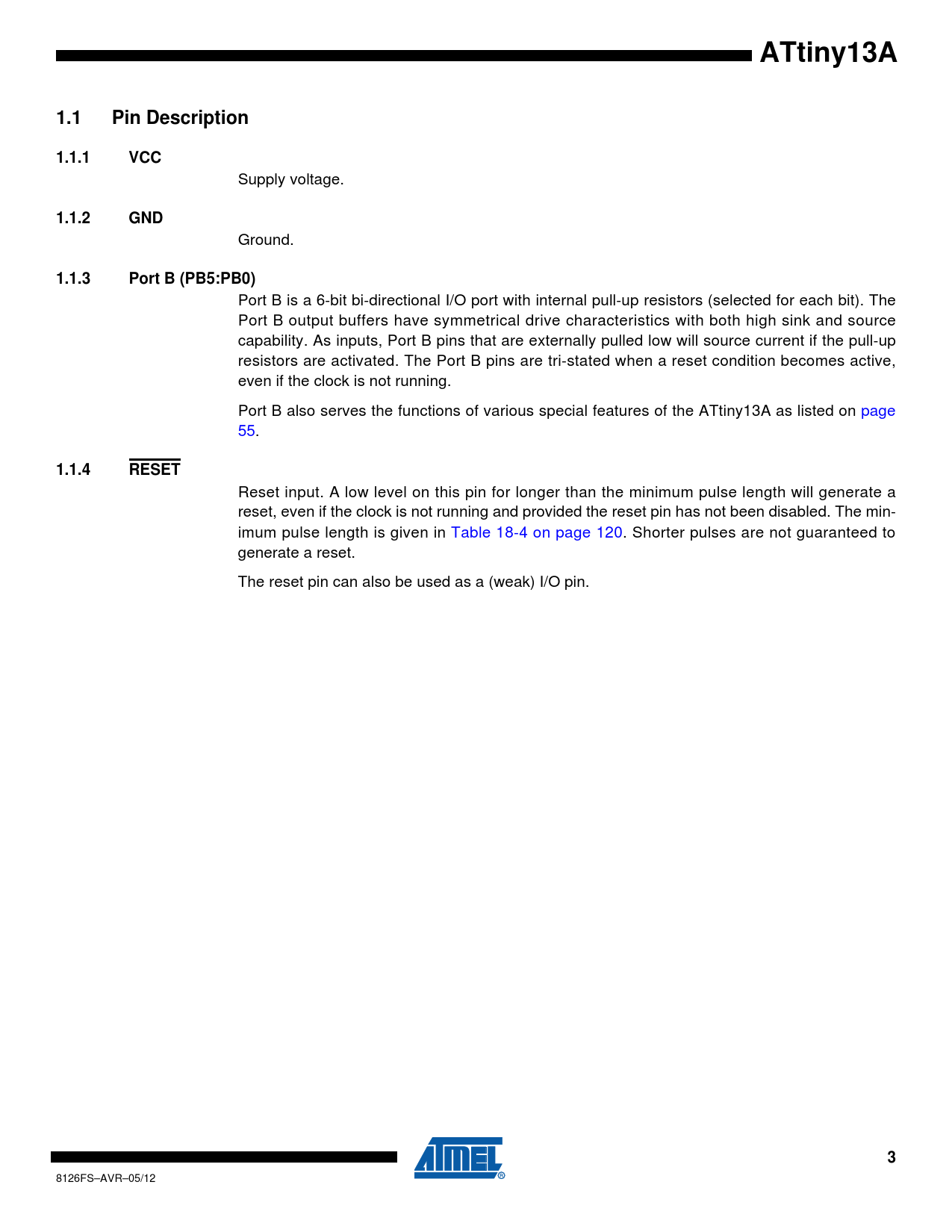 ATtiny13A. 1.1. Pin Description. 1.1.1. VCC. 1.1.2. GND. 1.1.3. Port B (PB5:PB0). 1.1.4. RESET