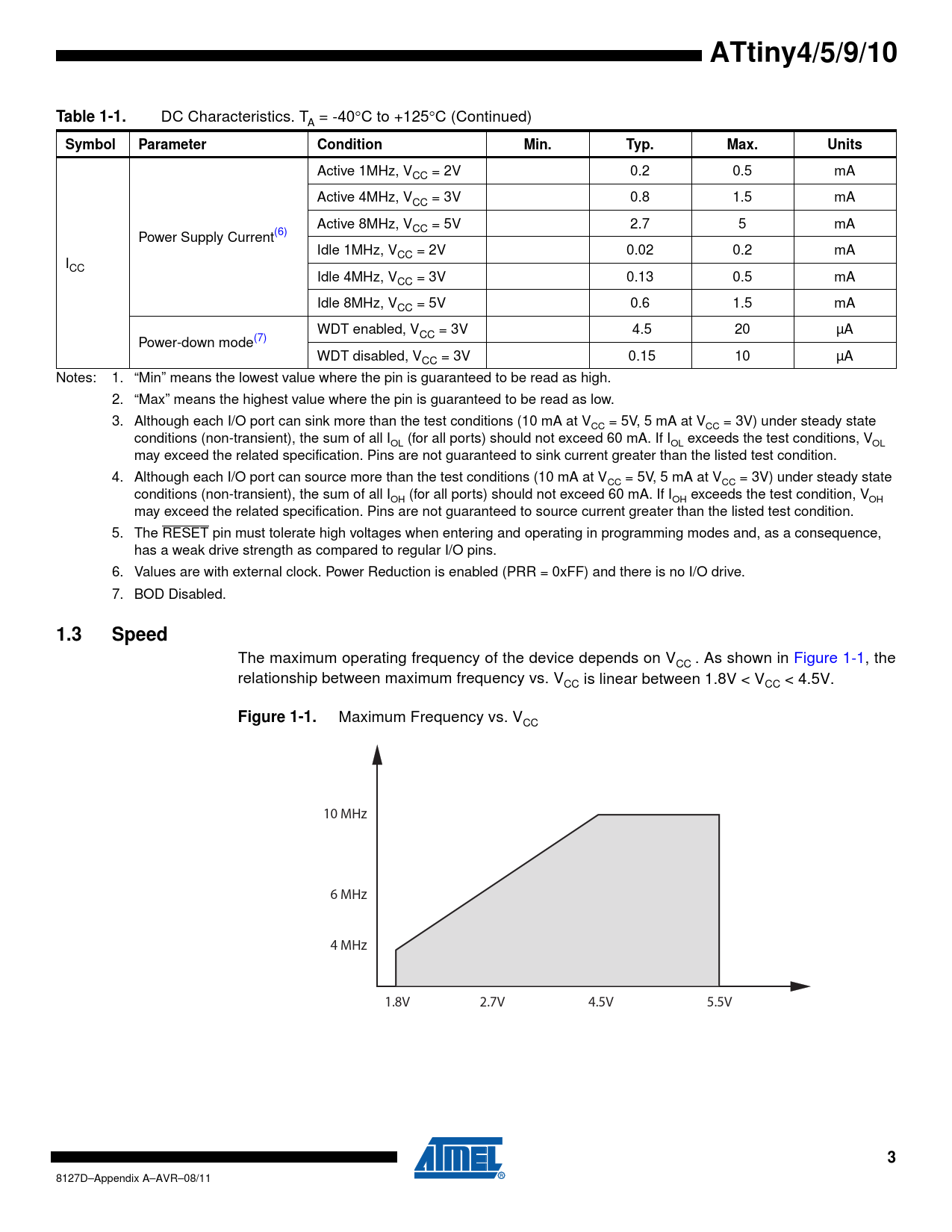 ATtiny4/5/9/10 Table 1-1 Symbol Parameter Condition Min Typ Max Units 1.3 Speed Figure 1-1