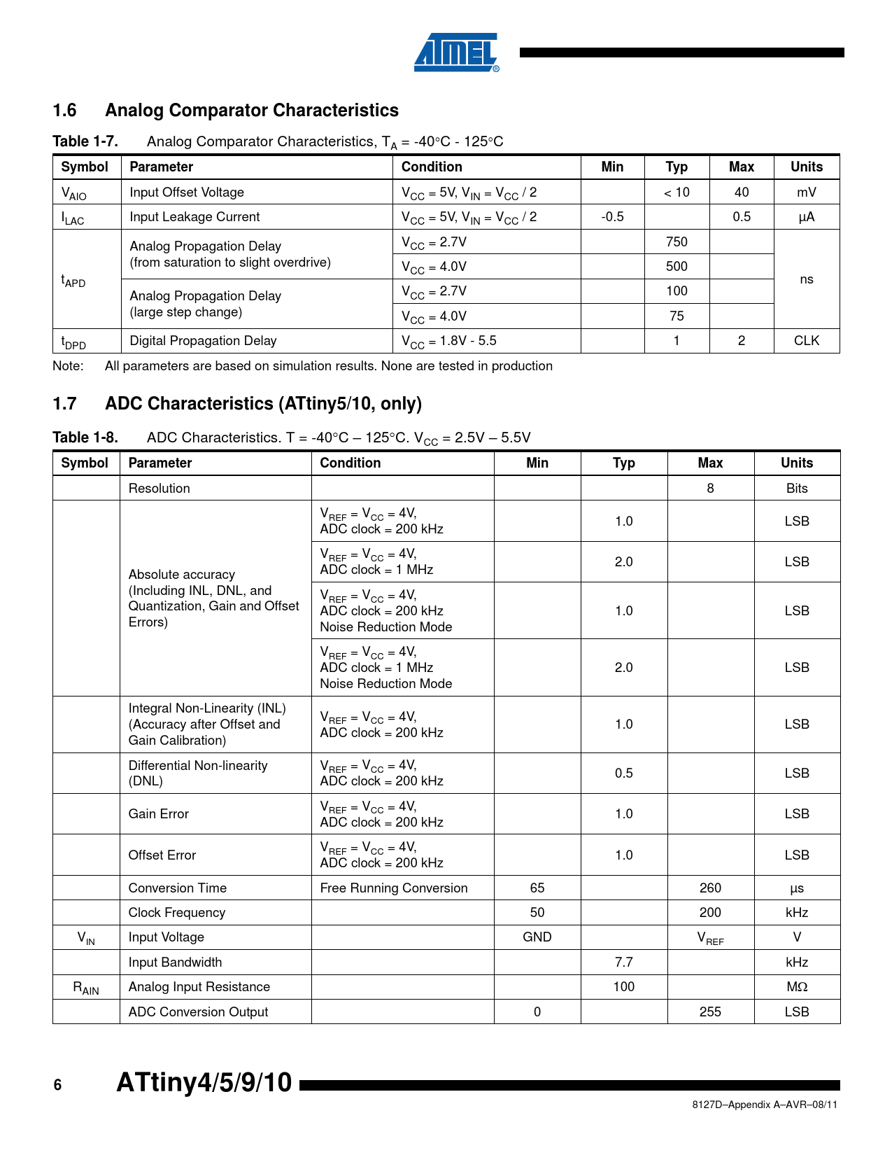 1.6. Analog Comparator Characteristics. Table 1-7. Symbol. Parameter. Condition. Min. Typ. Max. Units. 1.7