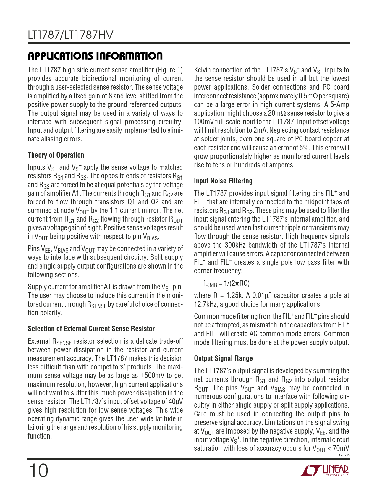 The LT1787 high side current sense amplifier (Figure 1) Kelvin connection of the LT1787’s V + – S and VS inputs to provides accurate bidirectional monitoring of current the sense resistor should be used in all but the lowest through a user-selected sense resistor. The sense voltage power applications. Solder connections and PC board is amplified by a fixed gain of 8 and level shifted from the interconnect resistance (approximately 0.5mΩ per square) positive power supply to the ground referenced outputs. can be a large error in high current systems. A 5-Amp The output signal may be used in a variety of ways to application might choose a 20mΩ sense resistor to give a interface with subsequent signal processing circuitry. 100mV full-scale input to the LT1787. Input offset voltage Input and output filtering are easily implemented to elimi- will limit resolution to 2mA. Neglecting contact resistance nate aliasing errors. at solder joints, even one square of PC board copper at each resistor end will cause an error of 5%. This error will