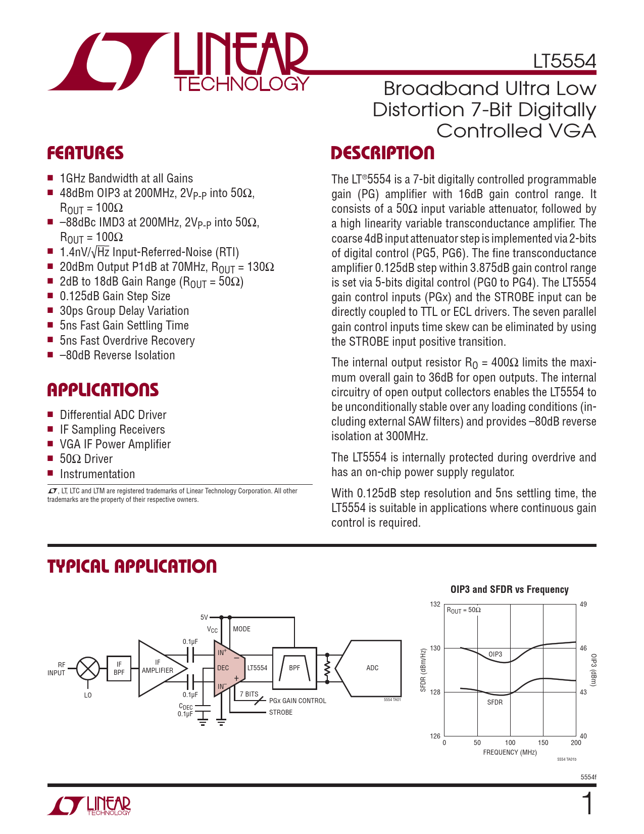 LT5554 Broadband Ultra Low Distortion 7-Bit Digitally Controlled VGA FEATURESDESCRIPTION n 1GHz Bandwidth at all Gains The LT®5554 is a 7-bit digitally controlled programmable n 48dBm OIP3 at 200MHz, 2VP-P into 50Ω, gain (PG) amplifi er with 16dB gain control range. It ROUT = 100Ω consists of a 50Ω input variable attenuator, followed by n –88dBc IMD3 at 200MHz, 2VP-P into 50Ω, a high linearity variable transconductance amplifi er. The ROUT = 100Ω coarse 4dB input attenuator step is implemented via 2-bits n 1.4nV/√Hz Input-Referred-Noise (RTI) of digital control (PG5, PG6). The fi ne transconductance n 20dBm Output P1dB at 70MHz, ROUT = 130Ω amplifi er 0.125dB step within 3.875dB gain control range n 2dB to 18dB Gain Range (ROUT = 50Ω) is set via 5-bits digital control (PG0 to PG4). The LT5554 n 0.125dB Gain Step Size gain control inputs (PGx) and the STROBE input can be n 30ps Group Delay Variation directly coupled to TTL or ECL drivers. The seven parallel n 5ns Fast Gain Settling Time gain control inputs time skew can be eliminated by using n 5ns Fast Overdrive Recovery the STROBE input positive transition. n –80dB Reverse Isolation The internal output resistor RO = 400Ω limits the maxi- mum overall gain to 36dB for open outputs. The internal APPLICATIONS circuitry of open output collectors enables the LT5554 to be unconditionally stable over any loading conditions (in- n Differential ADC Driver cluding external SAW fi lters) and provides –80dB reverse n IF Sampling Receivers isolation at 300MHz. n VGA IF Power Amplifi er n 50Ω Driver The LT5554 is internally protected during overdrive and n Instrumentation has an on-chip power supply regulator. L, LT, LTC and LTM are registered trademarks of Linear Technology Corporation. All other With 0.125dB step resolution and 5ns settling time, the trademarks are the property of their respective owners. LT5554 is suitable in applications where continuous gain control is required. TYPICAL APPLICATIONOIP3 and SFDR vs Frequency 132 49 ROUT = 50Ω 5V VCC MODE 0.1μF 130 46 IN+ OIP3 (dBm) OIP3 – RF IF IF DEC BPF ADC INPUT BPF AMPLIFIER LT5554 + IN– SFDR (dBm/Hz) 128 43 LO 0.1μF 7 BITS 5554 TA01 PGx GAIN CONTROL SFDR CDEC 0.1μF STROBE 126 40 0 50 100 150 200 FREQUENCY (MHz) 5554 TA01b 5554f 1