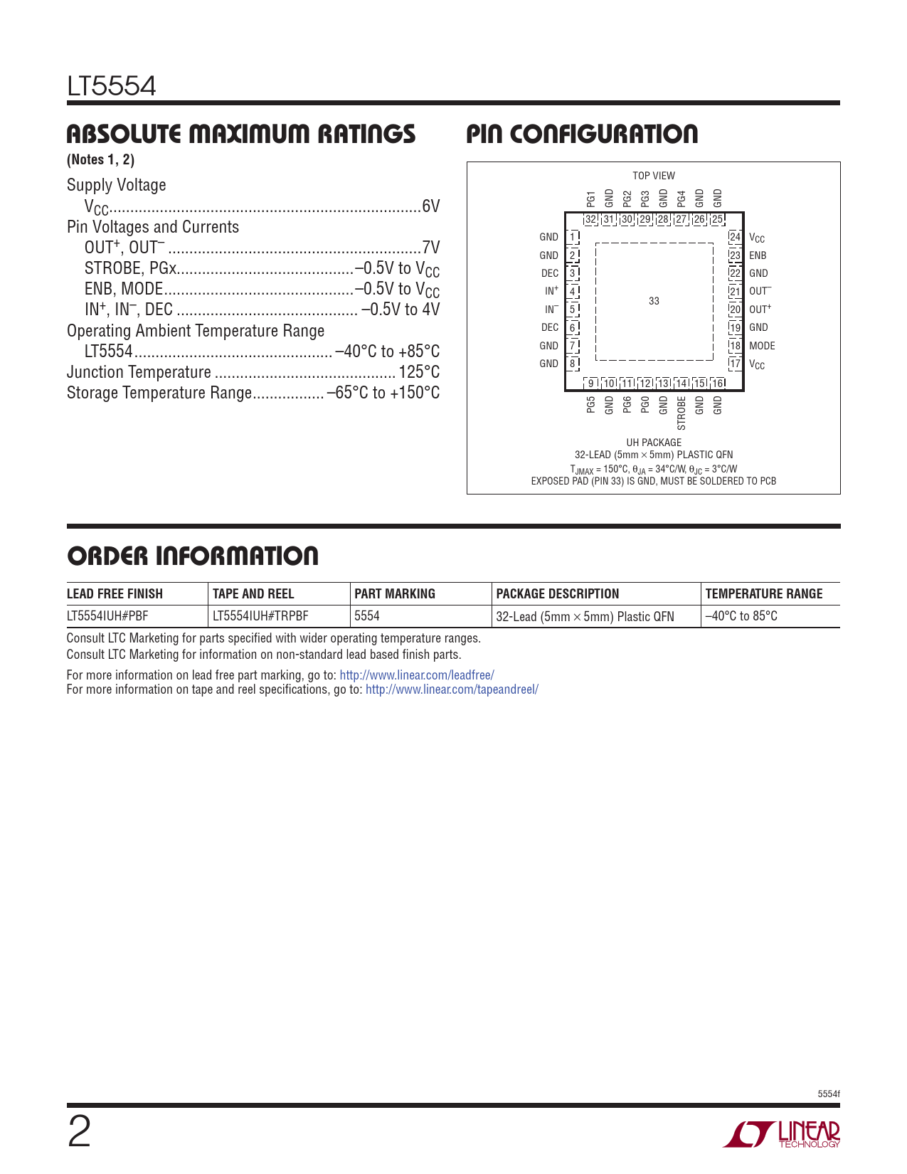 TOP VIEW Supply Voltage V PG1 GND PG2 PG3 GND PG4 GND GND CC ..6V Pin Voltages and Currents 32 31 30 29 28 27 26 25 GND 1 24 V OUT+, OUT– ..7V CC GND 2 23 ENB STROBE, PGx ..–0.5V to VCC DEC 3 22 GND ENB, MODE ...–0.5V to VCC IN+ 4 21 OUT– 33 IN+, IN–, DEC ... –0.5V to 4V IN– 5 20 OUT+ Operating Ambient Temperature Range DEC 6 19 GND LT5554 ... –40°C to +85°C GND 7 18 MODE GND 8 17 V Junction Temperature ... 125°C CC 9 10 11 12 13 14 15 16 Storage Temperature Range ... –65°C to +150°C PG5 GND PG6 PG0 GND GND GND STROBE UH PACKAGE 32-LEAD (5mm s 5mm) PLASTIC QFN TJMAX = 150°C, θJA = 34°C/W, θJC = 3°C/W EXPOSED PAD (PIN 33) IS GND, MUST BE SOLDERED TO PCB