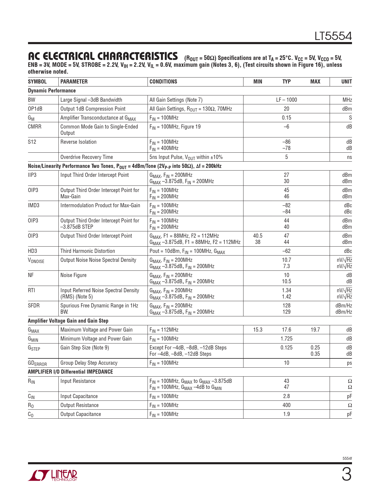 AC ELECTRICAL CHARACTERISTICS (ROUT = 50Ω) Specifi cations are at TA = 25°C. VCC = 5V, VCCO = 5V, ENB = 3V, MODE = 5V, STROBE = 2.2V, VIH = 2.2V, VIL = 0.6V, maximum gain (Notes 3, 6), (Test circuits shown in Figure 16), unless otherwise noted. SYMBOL PARAMETER CONDITIONS MIN TYP MAX UNIT Dynamic Performance