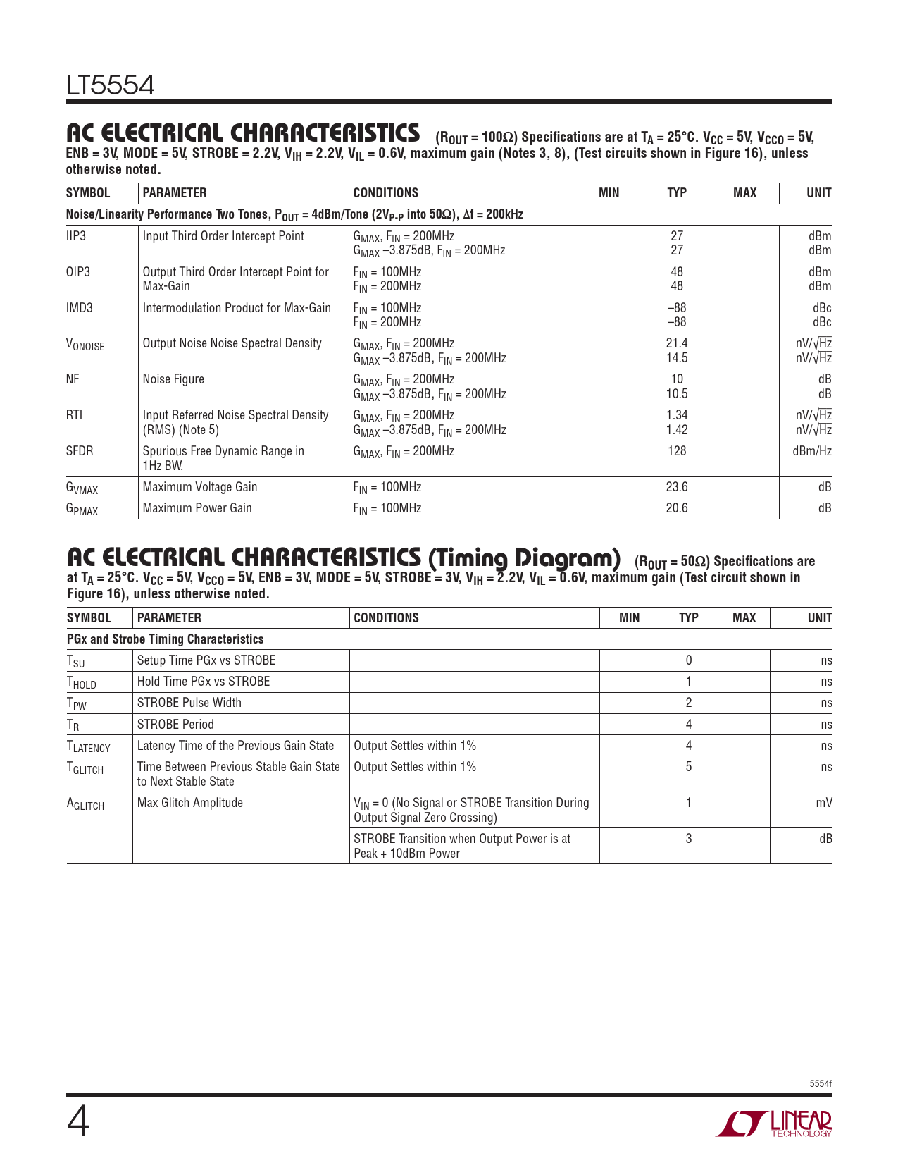 TSU Setup Time PGx vs STROBE 0 ns THOLD Hold Time PGx vs STROBE 1 ns TPW STROBE Pulse Width 2 ns TR STROBE Period 4 ns TLATENCY Latency Time of the Previous Gain State Output Settles within 1% 4 ns TGLITCH Time Between Previous Stable Gain State Output Settles within 1% 5 ns to Next Stable State AGLITCH Max Glitch Amplitude VIN = 0 (No Signal or STROBE Transition During 1 mV Output Signal Zero Crossing) STROBE Transition when Output Power is at 3 dB Peak + 10dBm Power 5554f 4