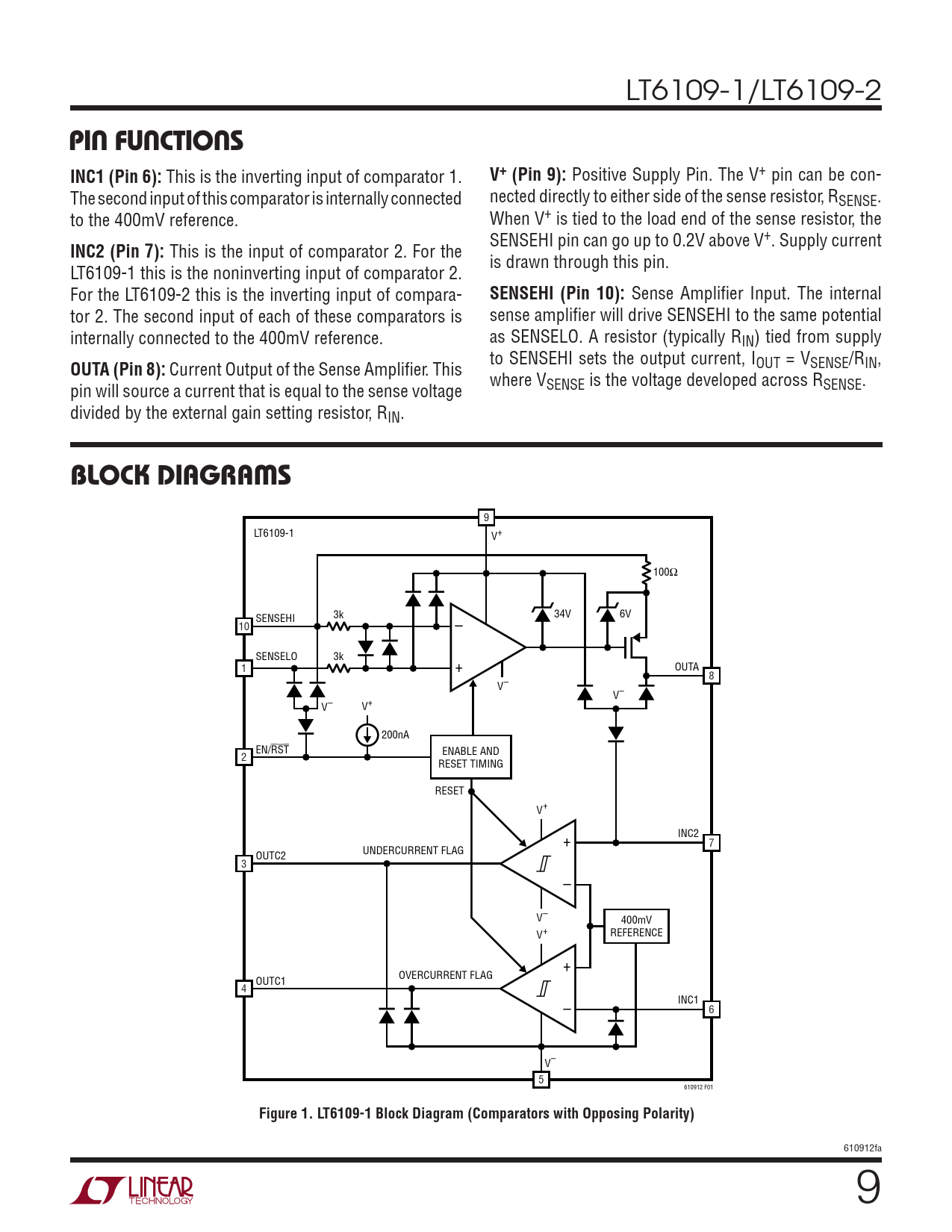 9 LT6109-1 V+ 100Ω 3k SENSEHI 34V 6V 10 – SENSELO 3k 1 + OUTA 8 V– V– V– V+ 200nA EN/RST 2 ENABLE AND RESET TIMING RESET V+ + INC2 7 UNDERCURRENT FLAG OUTC2 3 – V– 400mV V+ REFERENCE + OVERCURRENT FLAG OUTC1 4 – INC1 6 V– 5 610912 F01