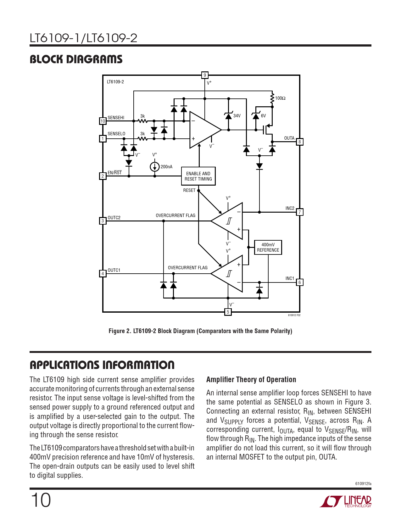 LT6109-1/LT6109-2 BLOCK DIAGRAMS 9 LT6109-2 V+ 100Ω 3k SENSEHI 34V 6V 10 – SENSELO 3k 1 + OUTA 8 V– V– V– V+ 200nA EN/RST 2 ENABLE AND RESET TIMING RESET V+ – INC2 7 OVERCURRENT FLAG OUTC2 3 + V– 400mV V+ REFERENCE + OVERCURRENT FLAG OUTC1 4 – INC1 6 V– 5 610912 F02 Figure 2. LT6109-2 Block Diagram (Comparators with the Same Polarity)APPLICATIONS INFORMATION The LT6109 high side current sense amplifier provides Amplifier Theory of Operation accurate monitoring of currents through an external sense An internal sense amplifier loop forces SENSEHI to have resistor. The input sense voltage is level-shifted from the the same potential as SENSELO as shown in Figure 3. sensed power supply to a ground referenced output and Connecting an external resistor, R is amplified by a user-selected gain to the output. The IN, between SENSEHI and V output voltage is directly proportional to the current flow- SUPPLY forces a potential, VSENSE, across RIN. A corresponding current, I ing through the sense resistor. OUTA, equal to VSENSE/RIN, will flow through RIN. The high impedance inputs of the sense The LT6109 comparators have a threshold set with a built-in amplifier do not load this current, so it will flow through 400mV precision reference and have 10mV of hysteresis. an internal MOSFET to the output pin, OUTA. The open-drain outputs can be easily used to level shift to digital supplies. 610912fa 10 Document Outline Features Description Applications Typical Application Absolute Maximum Ratings Pin Configuration Order Information Electrical Characteristics Typical Performance Characteristics Pin Functions Block Diagrams Applications Information Typical Applications Package Description Revison History Typical Application Related Parts