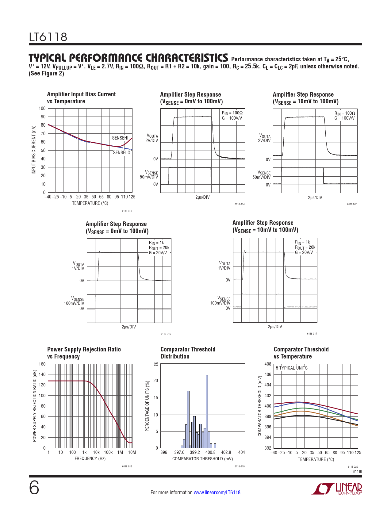 160 25 408 5 TYPICAL UNITS 140 406 20 TIO (dB) 120 404 100 402 15 80 400 Y REJECTION RA 10 60 398 40 396 PERCENTAGE OF UNITS (%) 5 COMPARATOR THRESHOLD (mV) 20 394 POWER SUPPL 0 0 392 1 10 100 1k 10k 100k 1M 10M 396 397.6 399.2 400.8 402.8 404 –40 –25 –10 5 20 35 50 65 80 95 110 125 FREQUENCY (Hz) COMPARATOR THRESHOLD (mV) TEMPERATURE (°C) 6118 G18 6118 G19 6118 G20 6118f 6 For more information www.linear.com/LT6118 Document Outline Features Description Applications Typical Application Absolute Maximum Ratings Pin Configuration Order Information Electrical Characteristics Typical Performance Characteristics Pin Functions Block Diagram Applications Information Typical Applications Package Description Typical Application Related Parts